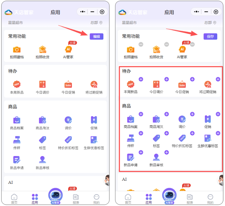 目录 搜索 天店星锐·学习指南天店星锐·Windows人工收银使用须知注册&前台登录界面使用销售商品查询会员结算退货其他微订单聚合外卖库存查询交易查询寄存功能收银对账系统功能帮助导航风格切换最小化收银对账设置POS快捷键打印 & 钱箱外设秤相关其他扫码付主题界面设置模板锁屏退出场景应用营业员使用流程挂单使用流程培训模式预设商品业务预包装使用流程AI使用流程类别限定显示收银流程常见咨询安装咨询登录咨询核销咨询交易时已经支付款项,但是软件未有流水记录结算咨询适配型号大全PC打印机型号适配PC计价秤支持型号客显支持型号叠加器支持型号Windows促销案例天店星锐·Windows自助收银使用须知登录使用基础设置收银流程支持打印机型号Windows自助收银促销案例天店星锐·Android POS收银使用须知注册&登录系统功能帮助导航风格切换收银对账设置POS快捷键打印&钱箱外设秤相关其他扫码付主题界面设置模板锁屏退出界面使用销售商品查询会员结算退货其他导航微订单聚合外卖库存查询交易查询收银对账适配型号大全安卓pos端·计价秤支持型号Android POS促销案例天店星锐·Android大屏自助收银下载 & 购买设备登录收银设置收银流程适配型号大全安卓自助大屏·计价秤支持型号Android自助大屏支持促销类型天店星锐·Android 手机收银下载 & 购买登录使用基础设置收银操作Android手机收银促销案例天店星锐·天店管家使用须知绑定&授权程序登录&入口购买账号首页应用常用功能待办本周新品今日调价今日促销将过期促销商品商品档案商品淘汰调价促销传称标签特价折扣标签生鲜优惠标签新品申请新品审核AI拍照建档拍照收货Ai 管家采购订货收货退货供应商历史采购价采购设置配送要货调拨调拨收货批发批发订单批发销售批发退货客户客户收款库存盘点快速盘点门店库存查询入库出库转仓单报损单成本调价单领用单会员会员档案会员开卡积分冲减积分兑换礼券会员设置会员类别积分规则充值优惠规则零售付款方式设置支付设置POS登记前台销售设置微管家商品管理营销管理订单管理报表查询财务收入支出系统用户管理 授权码标签设置消息推送AI管家报表常用功能营业分析营业分析毛利分析门店分析单笔分析商品排行类别销售商品毛利时段销售我的月报商品查询库存查询报损查询库存调整查询出入库明细商品查询调价查询促销查询异常查询负毛利查询滞销查询低库存高库存收银查询收银对账交易明细收银异常操作营业员销售查询订单查询批发订单汇总门店要货汇总采购订单汇总会员查询会员分析储值明细会员消费明细会员积分明细批发查询批发查询批发商品排行批发类别销售批发业务员查询批发账款供应商查询联营销售查询供应商销售供应商采购退货供应商账款我的故障报修多账号切换系统设置完善商户基本资料付费用户管理天店星锐·管店小程序使用须知工作台微管家商品管理营销管理订单管理报表查询应用待办商品AI采购配送批发库存会员分析报表营业分析营业分析毛利分析门店分析笔单分析商品排行类别销售商品毛利时段销售我的月报商品查询库存查询报损查询商品查询调价查询促销查询异常查询负毛利查询滞销查询低库存高库存收银查询收银对账交易明细查询收银异常操作营业员销售查询订单查询批发订单汇总门店要货汇总采购订单汇总会员查询会员分析储值明细批发查询批发查询批发商品排行批发类别销售批发业务员查询批发账款供应商查询联营销售查询供应商销售供应商采购退货供应商账款我的VIP增值服务多账号切换系统设置打印设置总部订货、收货快速查询商品门店库存收货快速引用商品生成调价单单据详情显示售价及售价金额批发/收货/调拨引用单据时自动读取数量电子海报市斤计价标签设置天店星锐·Android大屏自助收银(旧版-不再维护)支持设备支付设置程序安装收银登录&设置收银流程支持促销类型&案例 暂无相关搜索结果! 本文档使用 MinDoc 发布 常用功能 常用功能位置: 天店管家小程序 -> 应用 -> 常用功能 作用: 经常用到的功能放到常用功能使用快速打开 点击常用功能右边的的编辑,下方功能菜单右上角会出现+号,可将对应功能菜单设置为常用功能,添加完成后点击保存即可。 如图所示 文档更新时间: 2026-01-22 06:07 作者:sundl