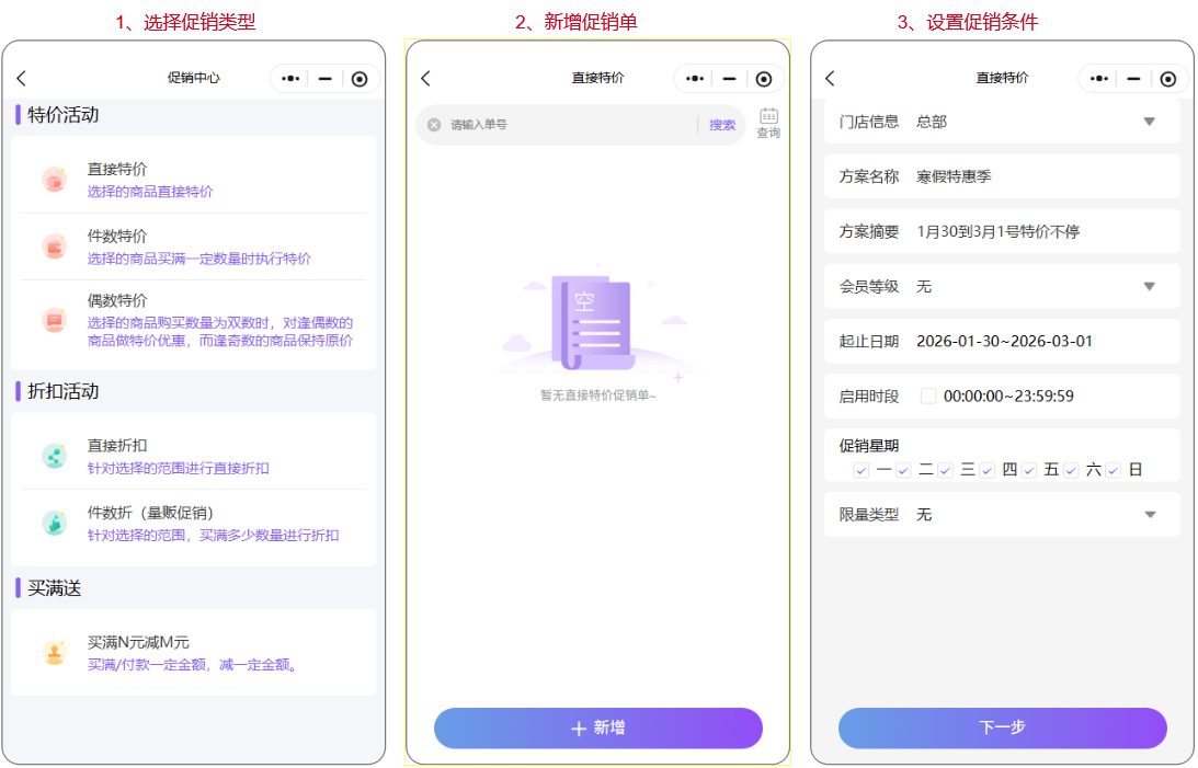 门店信息:总部账号支持给多个门店做促销单据,门店账号仅支持给本门店做单据;