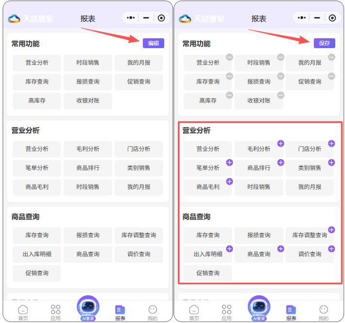 目录 搜索 天店星锐·学习指南天店星锐·Windows人工收银使用须知注册&前台登录界面使用销售商品查询会员结算退货其他微订单聚合外卖库存查询交易查询寄存功能收银对账系统功能帮助导航风格切换最小化收银对账设置POS快捷键打印 & 钱箱外设秤相关其他扫码付主题界面设置模板锁屏退出场景应用营业员使用流程挂单使用流程培训模式预设商品业务预包装使用流程AI使用流程类别限定显示收银流程常见咨询安装咨询登录咨询核销咨询交易时已经支付款项,但是软件未有流水记录结算咨询适配型号大全PC打印机型号适配PC计价秤支持型号客显支持型号叠加器支持型号Windows促销案例天店星锐·Windows自助收银使用须知登录使用基础设置收银流程支持打印机型号Windows自助收银促销案例天店星锐·Android POS收银使用须知注册&登录系统功能帮助导航风格切换收银对账设置POS快捷键打印&钱箱外设秤相关其他扫码付主题界面设置模板锁屏退出界面使用销售商品查询会员结算退货其他导航微订单聚合外卖库存查询交易查询收银对账适配型号大全安卓pos端·计价秤支持型号Android POS促销案例天店星锐·Android大屏自助收银下载 & 购买设备登录收银设置收银流程适配型号大全安卓自助大屏·计价秤支持型号Android自助大屏支持促销类型天店星锐·Android 手机收银下载 & 购买登录使用基础设置收银操作Android手机收银促销案例天店星锐·天店管家使用须知绑定&授权程序登录&入口购买账号首页应用常用功能待办本周新品今日调价今日促销将过期促销商品商品档案商品淘汰调价促销传称标签特价折扣标签生鲜优惠标签新品申请新品审核AI拍照建档拍照收货Ai 管家采购订货收货退货供应商历史采购价采购设置配送要货调拨调拨收货批发批发订单批发销售批发退货客户客户收款库存盘点快速盘点门店库存查询入库出库转仓单报损单成本调价单领用单会员会员档案会员开卡积分冲减积分兑换礼券会员设置会员类别积分规则充值优惠规则零售付款方式设置支付设置POS登记前台销售设置微管家商品管理营销管理订单管理报表查询财务收入支出系统用户管理 授权码标签设置消息推送AI管家报表常用功能营业分析营业分析毛利分析门店分析单笔分析商品排行类别销售商品毛利时段销售我的月报商品查询库存查询报损查询库存调整查询出入库明细商品查询调价查询促销查询异常查询负毛利查询滞销查询低库存高库存收银查询收银对账交易明细收银异常操作营业员销售查询订单查询批发订单汇总门店要货汇总采购订单汇总会员查询会员分析储值明细会员消费明细会员积分明细批发查询批发查询批发商品排行批发类别销售批发业务员查询批发账款供应商查询联营销售查询供应商销售供应商采购退货供应商账款我的故障报修多账号切换系统设置完善商户基本资料付费用户管理天店星锐·管店小程序使用须知工作台微管家商品管理营销管理订单管理报表查询应用待办商品AI采购配送批发库存会员分析报表营业分析营业分析毛利分析门店分析笔单分析商品排行类别销售商品毛利时段销售我的月报商品查询库存查询报损查询商品查询调价查询促销查询异常查询负毛利查询滞销查询低库存高库存收银查询收银对账交易明细查询收银异常操作营业员销售查询订单查询批发订单汇总门店要货汇总采购订单汇总会员查询会员分析储值明细批发查询批发查询批发商品排行批发类别销售批发业务员查询批发账款供应商查询联营销售查询供应商销售供应商采购退货供应商账款我的VIP增值服务多账号切换系统设置打印设置总部订货、收货快速查询商品门店库存收货快速引用商品生成调价单单据详情显示售价及售价金额批发/收货/调拨引用单据时自动读取数量电子海报市斤计价标签设置天店星锐·Android大屏自助收银(旧版-不再维护)支持设备支付设置程序安装收银登录&设置收银流程支持促销类型&案例 暂无相关搜索结果! 本文档使用 MinDoc 发布 常用功能 常用功能 常用功能 点击常用功能右边的的编辑,下方功能菜单右上角会出现+号,可将对应功能菜单设置为常用功能,添加完成后点击保存即可。 如图所示 文档更新时间: 2026-01-12 08:55 作者:sundl