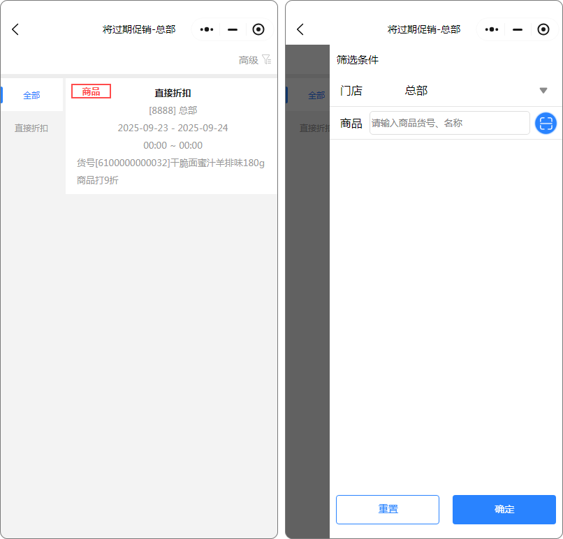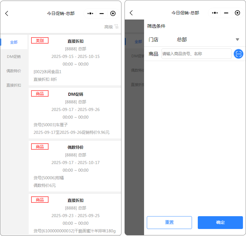 本周新品今日调价今日促销将过期促销本周新品用途说明:默认显示本周新增的商品 如建档时间是8月11号,8月11号~8月17号为一周,从建档时间开始算。 如图所示 今日调价用途说明:默认显示今天有调价的商品,直观的查看商品原价与新价。如图所示 今日促销用途说明:默认显示今天有促销的商品,如图所示 将过期促销用途说明:即将过期的促销如图所示 文档更新时间: 2025-09-25 03:09 作者:chenzhx
