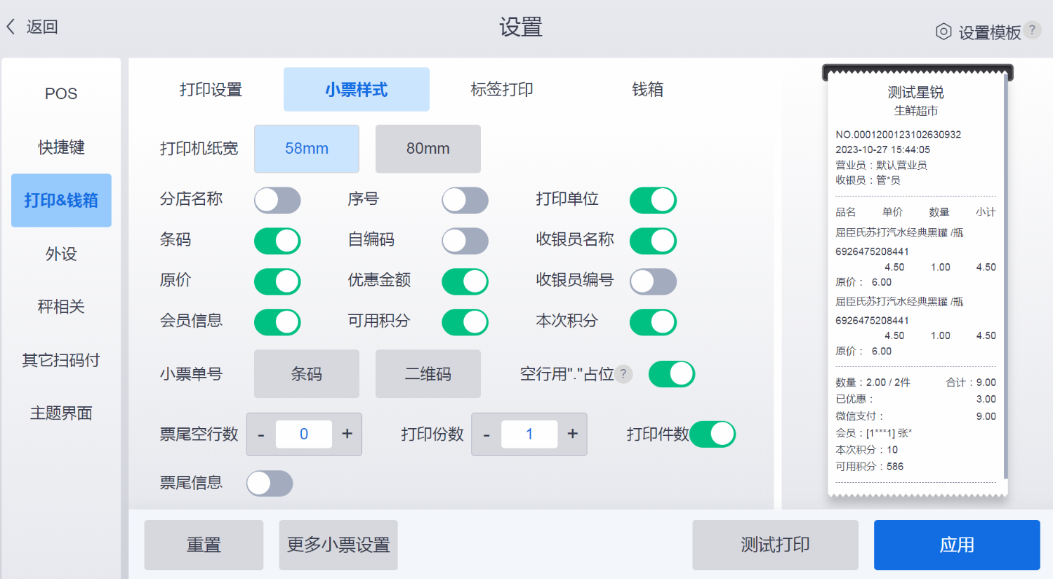 位置:【菜单栏】->【系统功能】-> 【设置】-> 【打印 & 钱箱】
