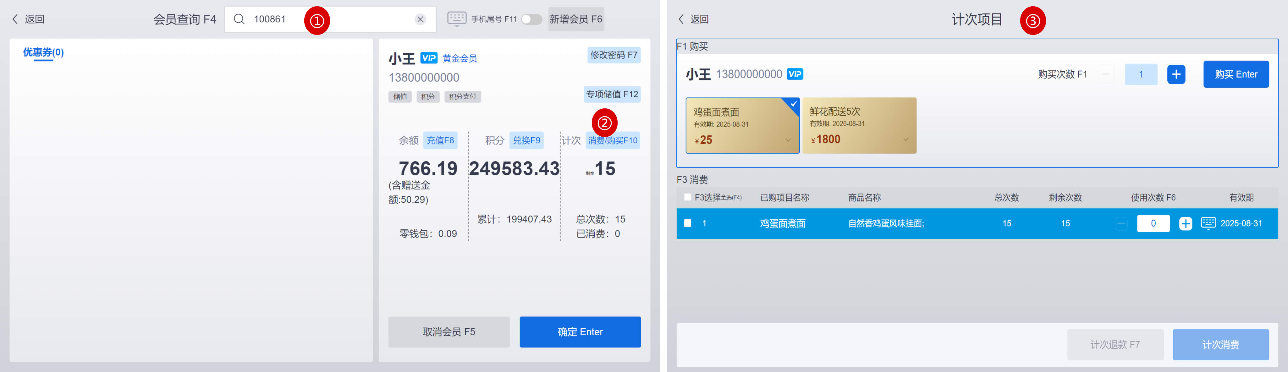 选择相关会员后,点击 计次功能(F10),进行次卡功能的购买以及使用操作。