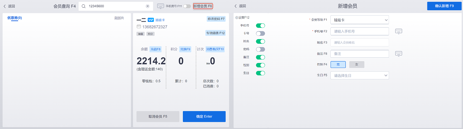 创建新会员(F6)时,请务必指定合适的会员等级,并提供手机号码;确认新增后,会员ID和会员卡号将与手机号关联。可自定义手机号、卡号、姓名、密码、备注、性别、生日等字段是否填写。
