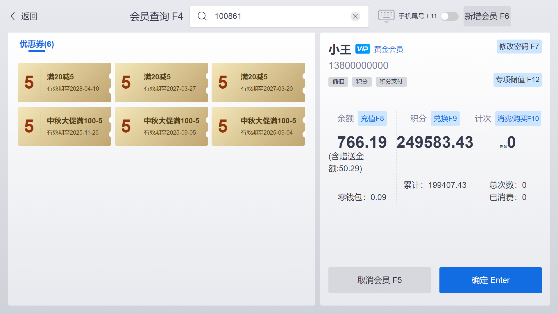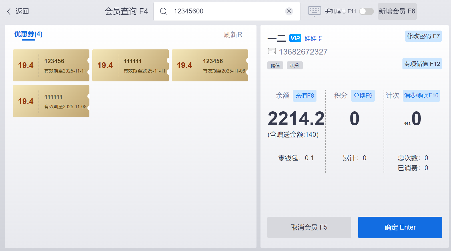 (2)可按F11 勾选手机尾号,输入手机后四位,进行相关会员查询