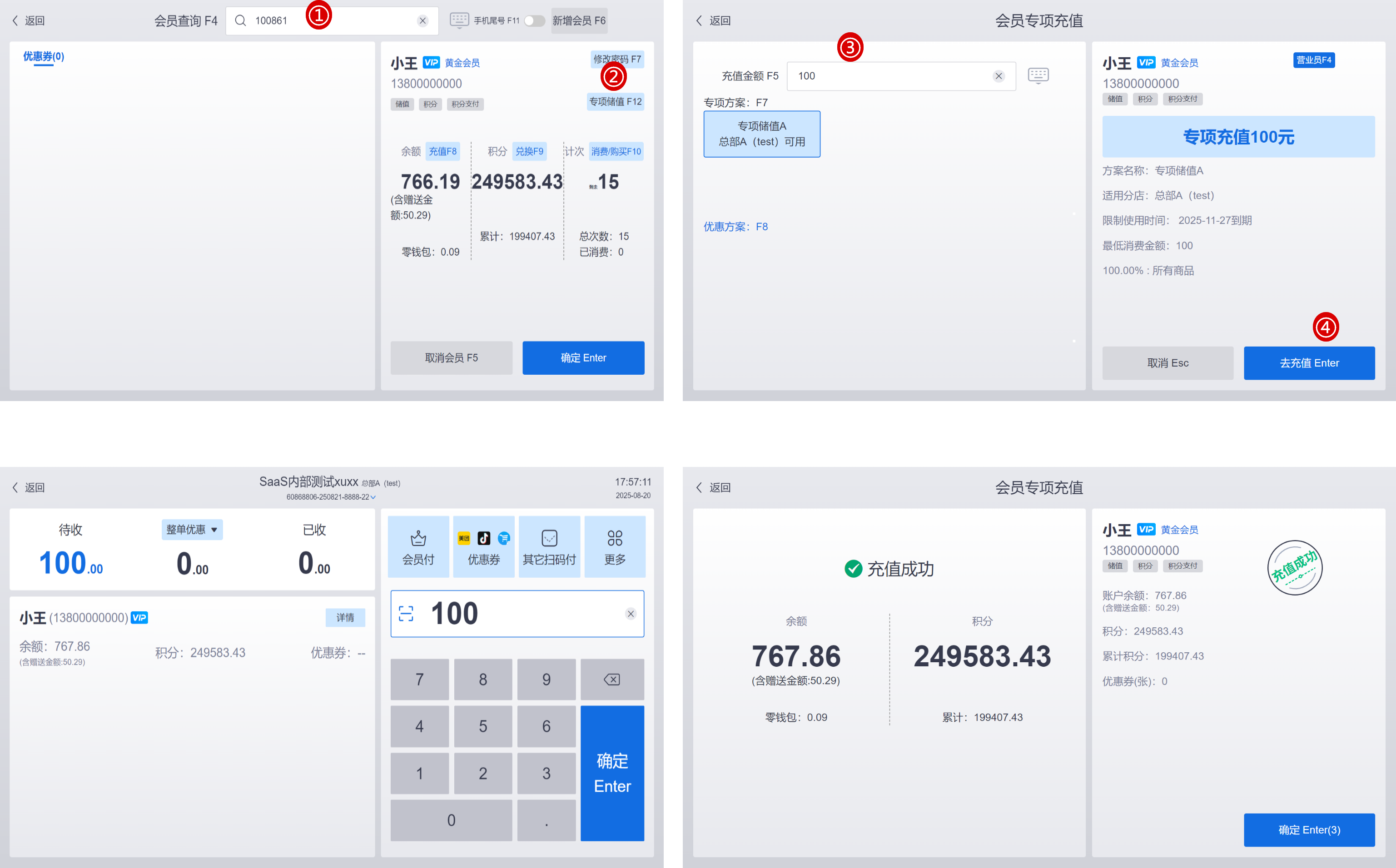 选择完需要充值的会员后,点击充值(F8),输入充值金额(F5),点击去结算后,输入金额付款即可