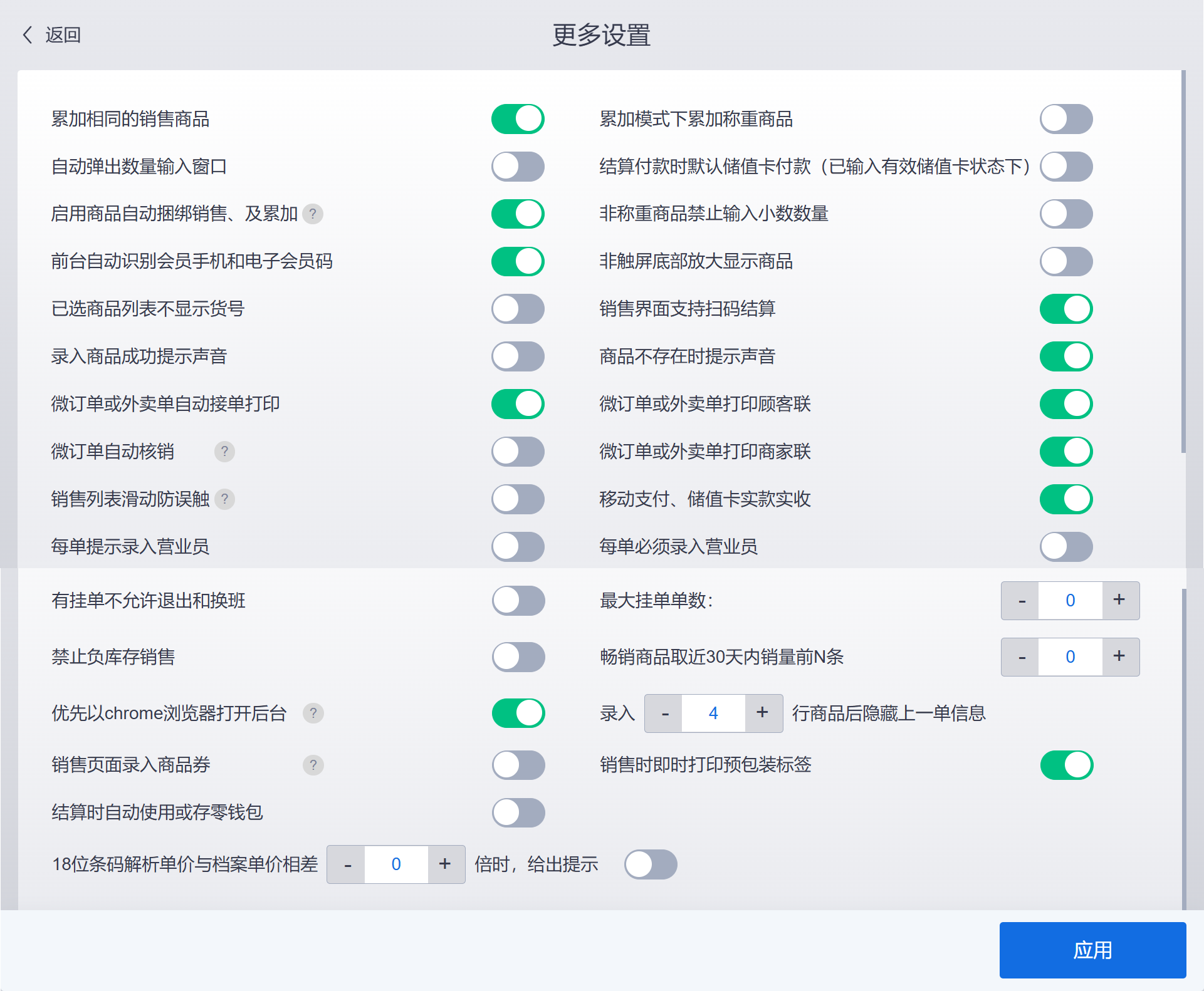 • 累加相同的销售商品:启用时,如价格一致的情况下,购物车内的相同普通商品累加合并;反之关闭时,普通商品则直接另起一行加入购物车