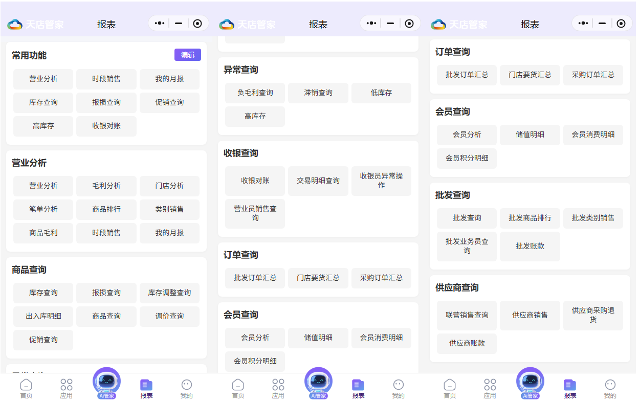 目录 搜索 天店星锐·学习指南天店星锐·Windows人工收银使用须知注册&前台登录界面使用销售商品查询会员结算退货其他微订单聚合外卖库存查询交易查询寄存功能收银对账系统功能帮助导航风格切换最小化收银对账设置POS快捷键打印 & 钱箱外设秤相关其他扫码付主题界面设置模板锁屏退出场景应用营业员使用流程挂单使用流程培训模式预设商品业务预包装使用流程AI使用流程类别限定显示收银流程常见咨询安装咨询登录咨询核销咨询交易时已经支付款项,但是软件未有流水记录结算咨询适配型号大全PC打印机型号适配PC计价秤支持型号客显支持型号叠加器支持型号Windows促销案例天店星锐·Windows自助收银使用须知登录使用基础设置收银流程支持打印机型号Windows自助收银促销案例天店星锐·Android POS收银使用须知注册&登录系统功能帮助导航风格切换收银对账设置POS快捷键打印&钱箱外设秤相关其他扫码付主题界面设置模板锁屏退出界面使用销售商品查询会员结算退货其他导航微订单聚合外卖库存查询交易查询收银对账适配型号大全安卓计价秤支持型号Android POS促销案例天店星锐·Android大屏自助收银下载 & 购买设备登录收银设置Android自助大屏支持促销类型天店星锐·Android大屏自助收银(旧版-不再维护)支持设备支付设置程序安装收银登录&设置收银流程支持促销类型&案例天店星锐·Android 手机收银下载 & 购买登录使用基础设置收银操作Android手机收银促销案例天店星锐·管店小程序使用须知工作台微管家商品管理营销管理订单管理报表查询应用待办商品AI采购配送批发库存会员分析报表营业分析营业分析毛利分析门店分析笔单分析商品排行类别销售商品毛利时段销售我的月报商品查询库存查询报损查询商品查询调价查询促销查询异常查询负毛利查询滞销查询低库存高库存收银查询收银对账交易明细查询收银异常操作营业员销售查询订单查询批发订单汇总门店要货汇总采购订单汇总会员查询会员分析储值明细批发查询批发查询批发商品排行批发类别销售批发业务员查询批发账款供应商查询联营销售查询供应商销售供应商采购退货供应商账款我的VIP增值服务多账号切换系统设置打印设置总部订货、收货快速查询商品门店库存收货快速引用商品生成调价单单据详情显示售价及售价金额批发/收货/调拨引用单据时自动读取数量电子海报市斤计价标签设置天店星锐·天店管家使用须知首页应用常用功能待办商品AI采购配送设置批发库存会员零售财务系统报表常用功能营业分析商品查询异常查询收银查询订单查询会员查询批发查询供应商查询我的 暂无相关搜索结果! 本文档使用 MinDoc 发布 报表 应用 常用功能 营业分析 商品查询 异常查询 收银查询 订单查询 会员查询 批发查询 供应商查询 如图所示 文档更新时间: 2026-01-09 08:12 作者:sundl