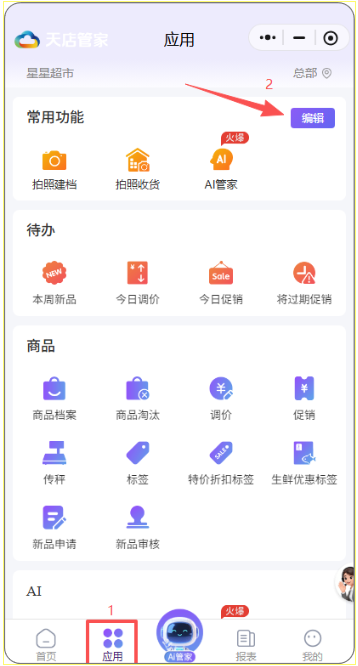 常用功能包括 拍照建档、拍照收货、AI管家、AI客服,可进入【应用】模块自定义编辑常用功能。
