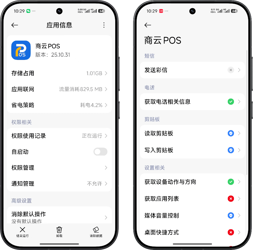 下载完成后,请先在手机-设置-应用设置,找到 【商云POS】 -【权限管理】 进行权限勾选
