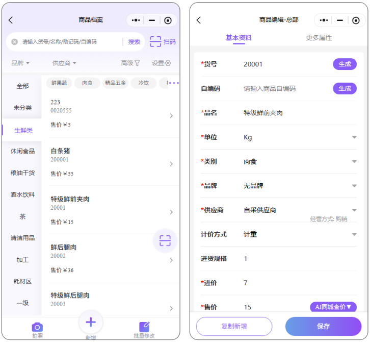- 基础属性:货号、自编码、商品名称、品名、单位、类别、品牌、供应商、计价方式、进货规格、进价、售价、助记码、规格、管理库存、商品图片、保质期、产地