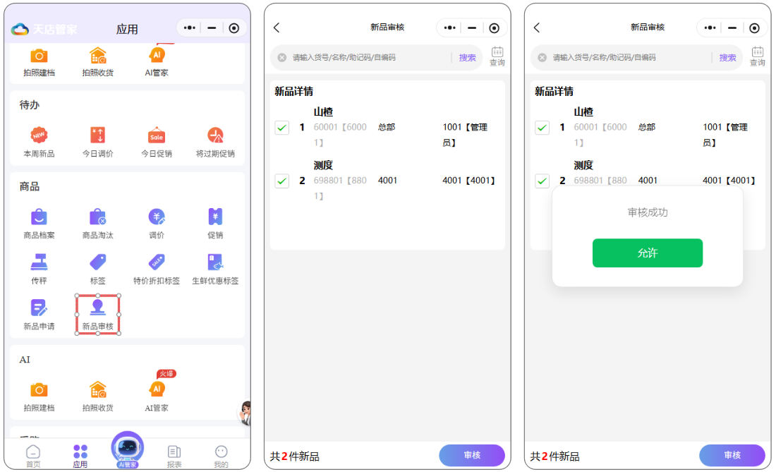 新品审核位置: 天店管家小程序 -> 应用-> 商品->新品审核作用:直营店或加盟门店可通过新品申请,申请的新品可由此审核; 未审核前可对该商品进行编辑,已审核的商品,此页面不在显示。如图所示 文档更新时间: 2026-01-20 02:46 作者:sundl