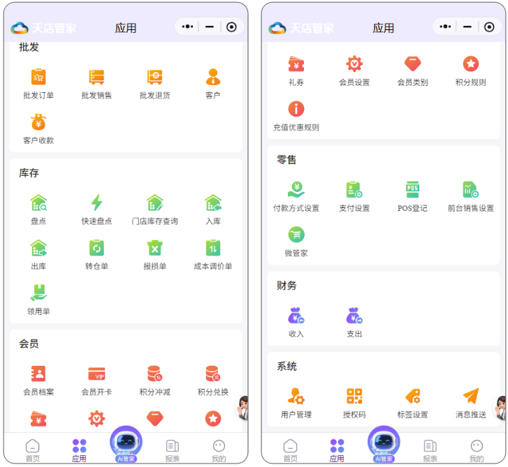 目录 搜索 天店星锐·学习指南天店星锐·Windows人工收银使用须知注册&前台登录界面使用销售商品查询会员结算退货其他微订单聚合外卖库存查询交易查询寄存功能收银对账系统功能帮助导航风格切换最小化收银对账设置POS快捷键打印 & 钱箱外设秤相关其他扫码付主题界面设置模板锁屏退出场景应用营业员使用流程挂单使用流程培训模式预设商品业务预包装使用流程AI使用流程类别限定显示收银流程常见咨询安装咨询登录咨询核销咨询交易时已经支付款项,但是软件未有流水记录结算咨询适配型号大全PC打印机型号适配PC计价秤支持型号客显支持型号叠加器支持型号Windows促销案例天店星锐·Windows自助收银使用须知登录使用基础设置收银流程支持打印机型号Windows自助收银促销案例天店星锐·Android POS收银使用须知注册&登录系统功能帮助导航风格切换收银对账设置POS快捷键打印&钱箱外设秤相关其他扫码付主题界面设置模板锁屏退出界面使用销售商品查询会员结算退货其他导航微订单聚合外卖库存查询交易查询收银对账适配型号大全安卓pos端·计价秤支持型号Android POS促销案例天店星锐·Android大屏自助收银下载 & 购买设备登录收银设置收银流程适配型号大全安卓自助大屏·计价秤支持型号Android自助大屏支持促销类型天店星锐·Android 手机收银下载 & 购买登录使用基础设置收银操作Android手机收银促销案例天店星锐·天店管家使用须知绑定&授权程序登录&入口购买账号首页应用常用功能待办本周新品今日调价今日促销将过期促销商品商品档案商品淘汰调价促销传称标签特价折扣标签生鲜优惠标签新品申请新品审核AI拍照建档拍照收货Ai 管家采购订货收货退货供应商历史采购价采购设置配送要货调拨调拨收货批发批发订单批发销售批发退货客户客户收款库存盘点快速盘点门店库存查询入库出库转仓单报损单成本调价单领用单会员会员档案会员开卡积分冲减积分兑换礼券会员设置会员类别积分规则充值优惠规则零售付款方式设置支付设置POS登记前台销售设置微管家商品管理营销管理订单管理报表查询财务收入支出系统用户管理 授权码标签设置消息推送AI管家报表常用功能营业分析营业分析毛利分析门店分析单笔分析商品排行类别销售商品毛利时段销售我的月报商品查询库存查询报损查询库存调整查询出入库明细商品查询调价查询促销查询异常查询负毛利查询滞销查询低库存高库存收银查询收银对账交易明细收银异常操作营业员销售查询订单查询批发订单汇总门店要货汇总采购订单汇总会员查询会员分析储值明细会员消费明细会员积分明细批发查询批发查询批发商品排行批发类别销售批发业务员查询批发账款供应商查询联营销售查询供应商销售供应商采购退货供应商账款我的故障报修多账号切换系统设置完善商户基本资料付费用户管理天店星锐·管店小程序使用须知工作台微管家商品管理营销管理订单管理报表查询应用待办商品AI采购配送批发库存会员分析报表营业分析营业分析毛利分析门店分析笔单分析商品排行类别销售商品毛利时段销售我的月报商品查询库存查询报损查询商品查询调价查询促销查询异常查询负毛利查询滞销查询低库存高库存收银查询收银对账交易明细查询收银异常操作营业员销售查询订单查询批发订单汇总门店要货汇总采购订单汇总会员查询会员分析储值明细批发查询批发查询批发商品排行批发类别销售批发业务员查询批发账款供应商查询联营销售查询供应商销售供应商采购退货供应商账款我的VIP增值服务多账号切换系统设置打印设置总部订货、收货快速查询商品门店库存收货快速引用商品生成调价单单据详情显示售价及售价金额批发/收货/调拨引用单据时自动读取数量电子海报市斤计价标签设置天店星锐·Android大屏自助收银(旧版-不再维护)支持设备支付设置程序安装收银登录&设置收银流程支持促销类型&案例 暂无相关搜索结果! 本文档使用 MinDoc 发布 应用 应用 常用功能 待办 商品 AI 采购 配送 批发 库存 会员 零售 财务 系统 如图所示 文档更新时间: 2026-01-20 05:12 作者:sundl