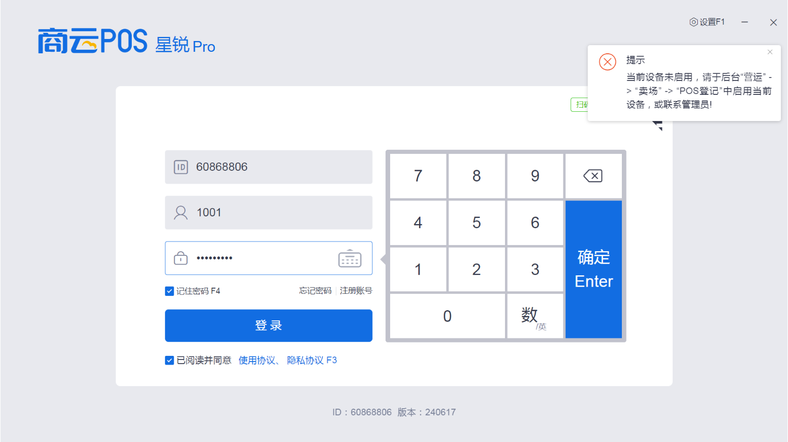 前台输入账号密码后无法登陆,提示:当前设备未启用,请于后台“营运” -> “卖场” -> “POS登记”中启用当前设备,或联系管理员!