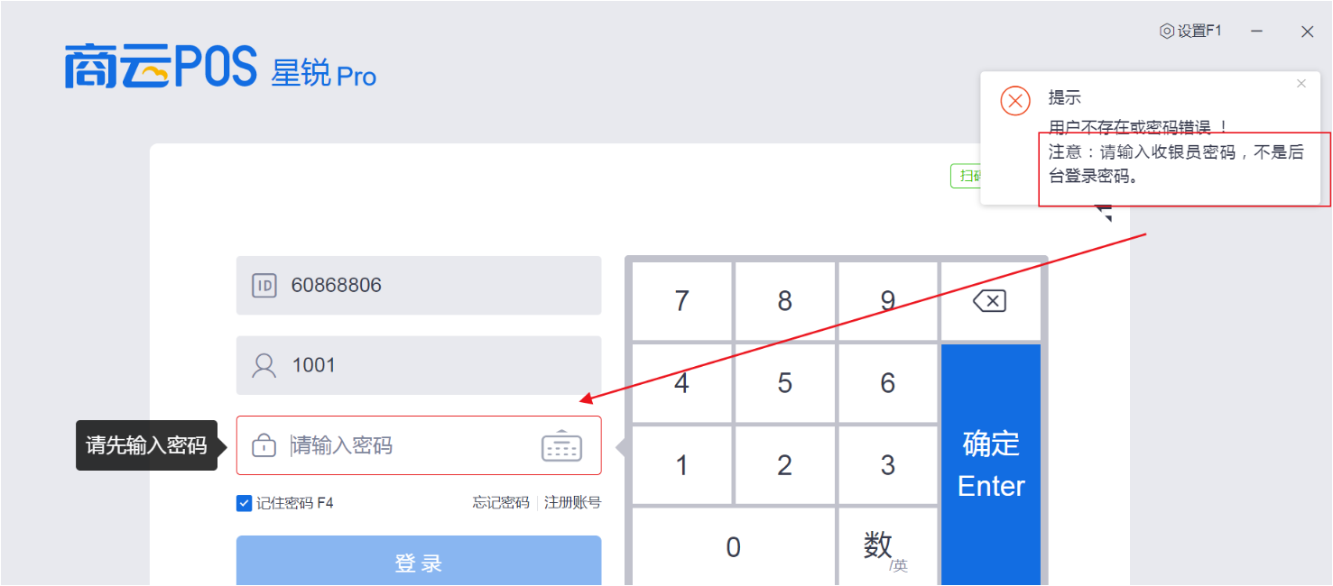 前台输入后台密码时无法登陆,提示:请输入收银员密码,不是后台登录密码