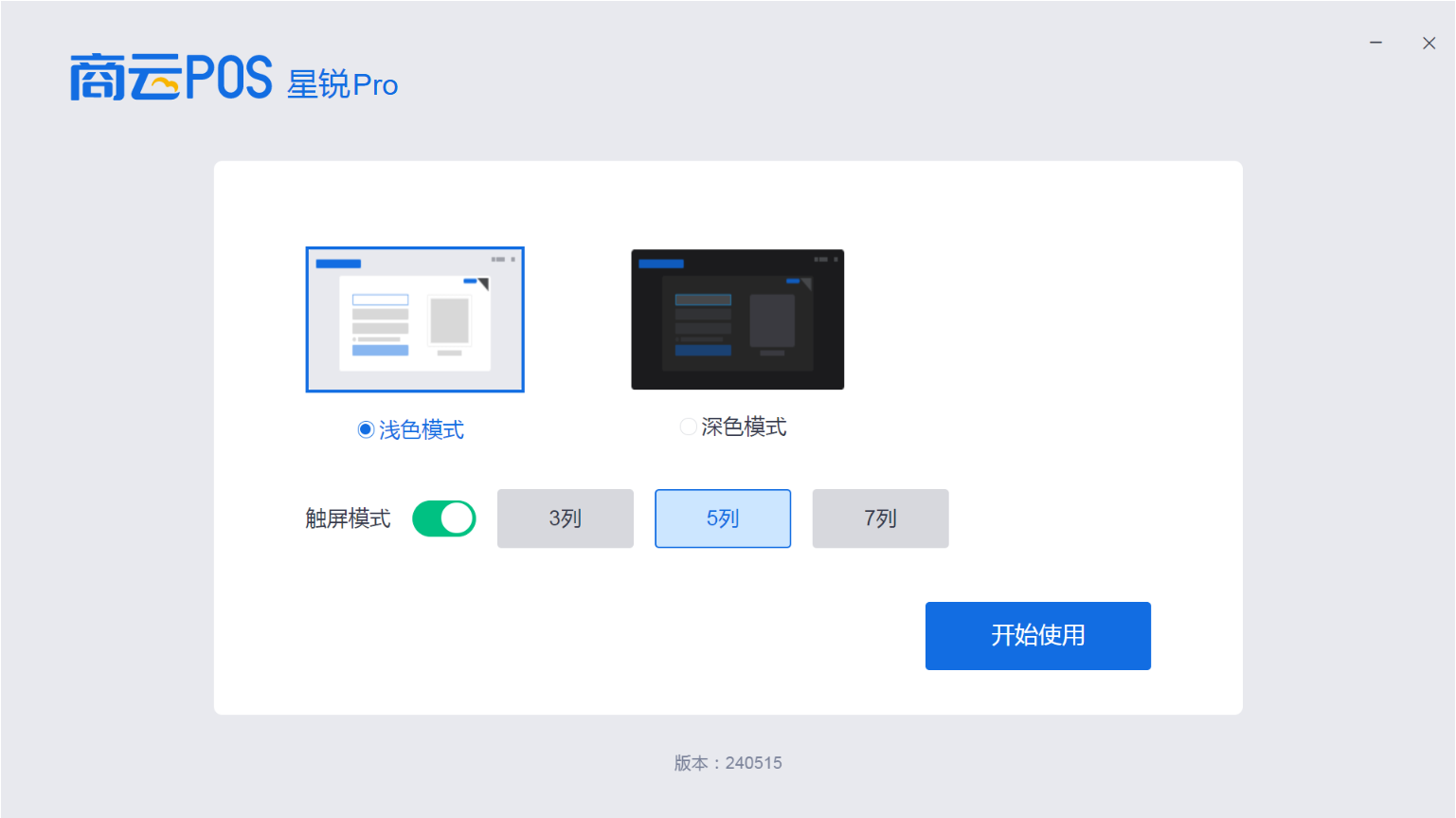 首次开启的情况下,可先配置前台使用外观和是否为触屏模式展示,点击开始使用。
