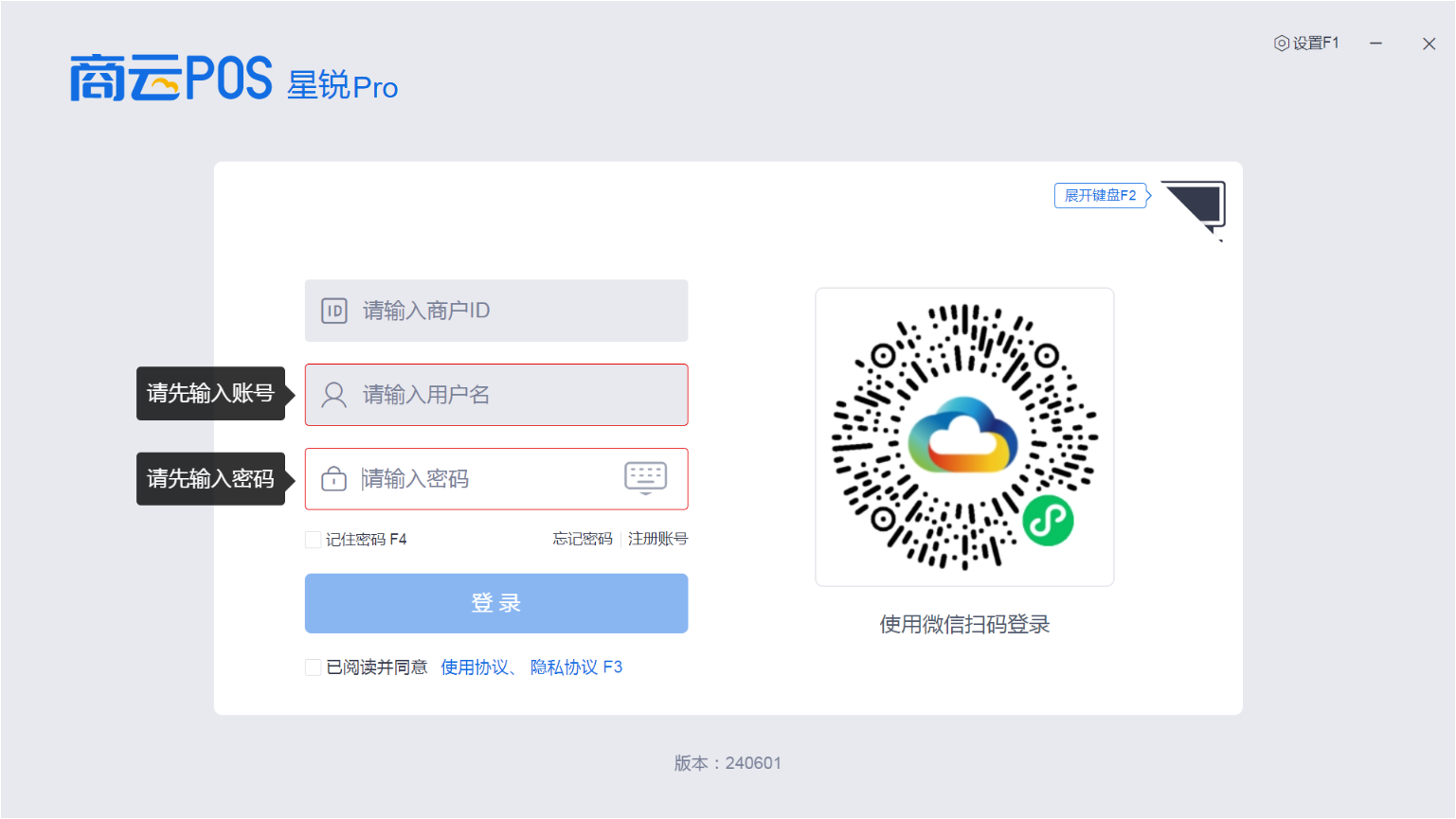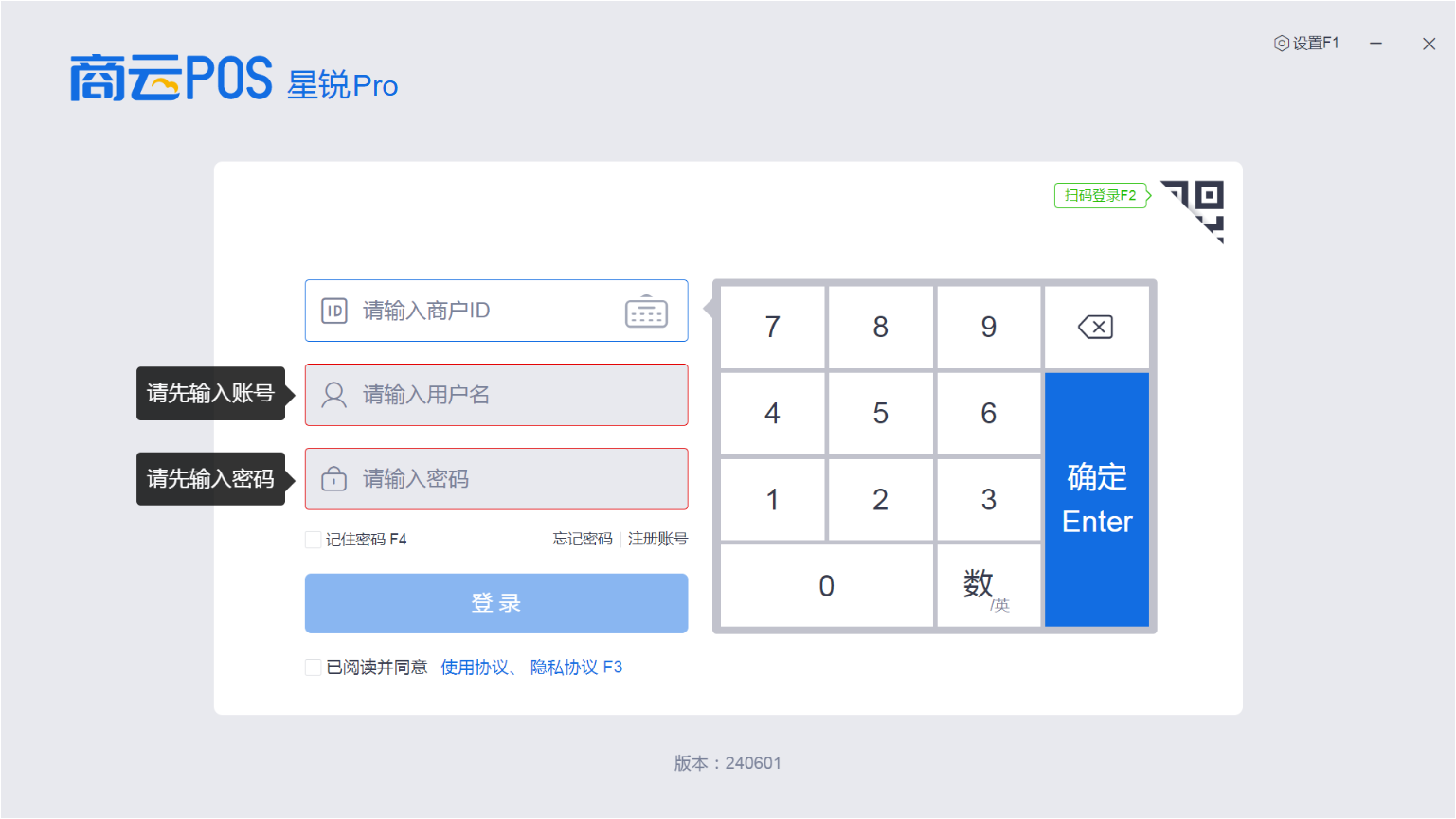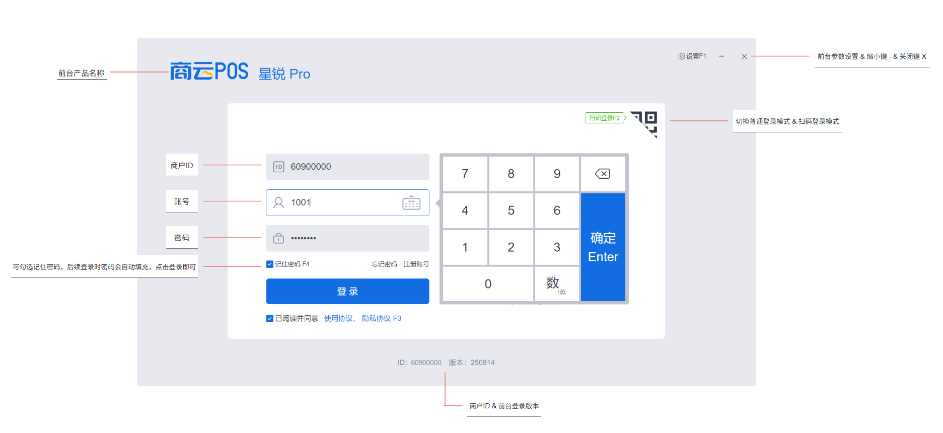 前台登录界面:可进行 登录账号收银 以及 前台〖设置〗配置;密码管理(包括找回或选择记住密码) 等相关操作。