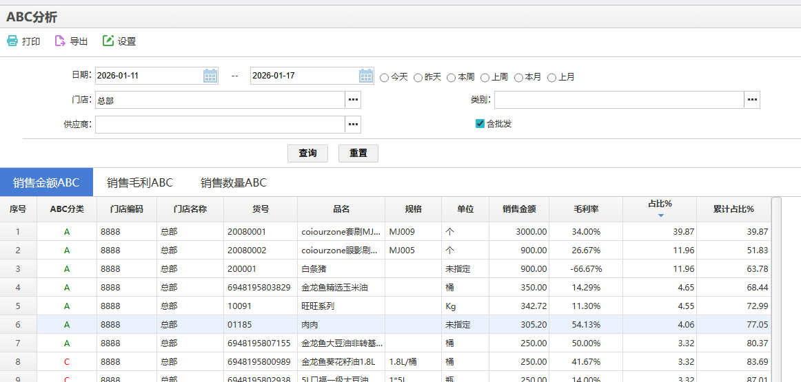 查询 销售毛利 按ABC占比统计。
