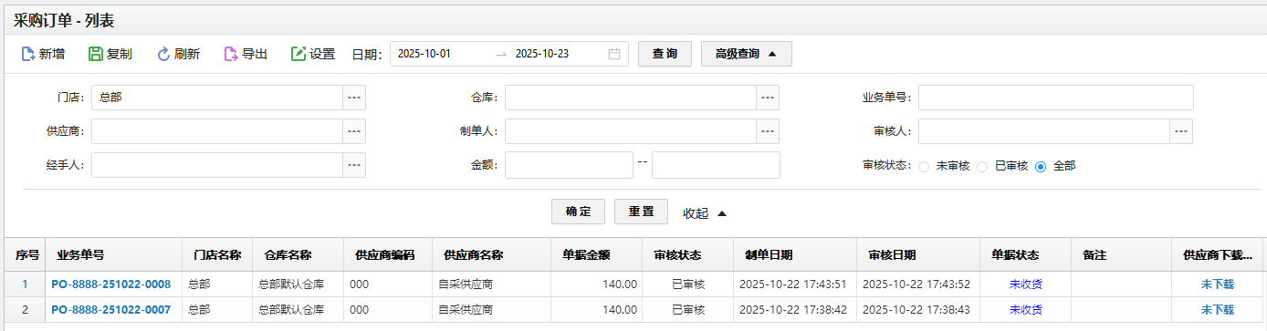 采购订单是商户根据商品库存、销售情况等因素制定采购订货计划,并下达至供应商按订单预先准备货品,以使商户能快速采购所需要的商品。