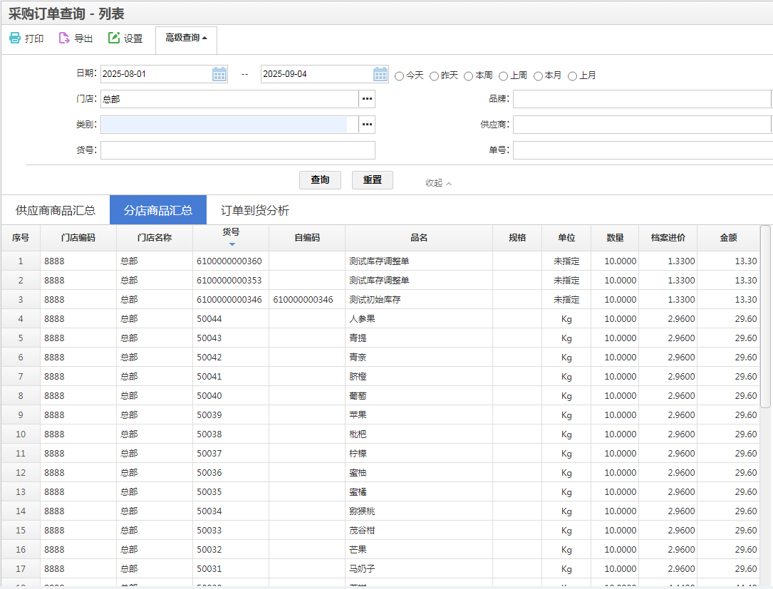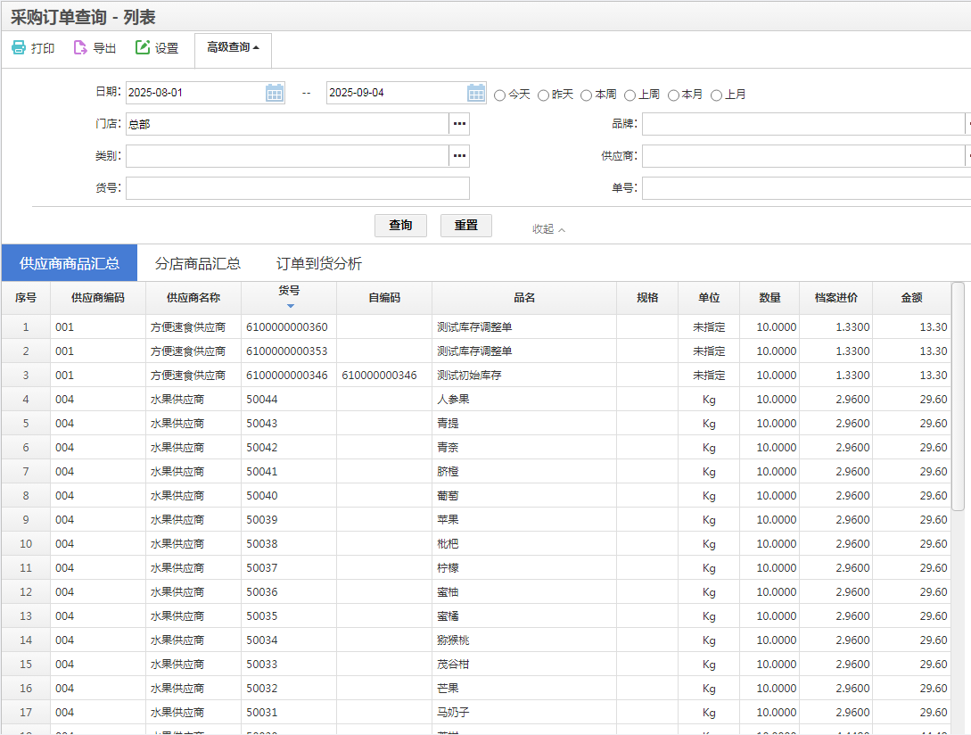 默认查询近本月 各采购订单各门店的采购明细汇总数据。