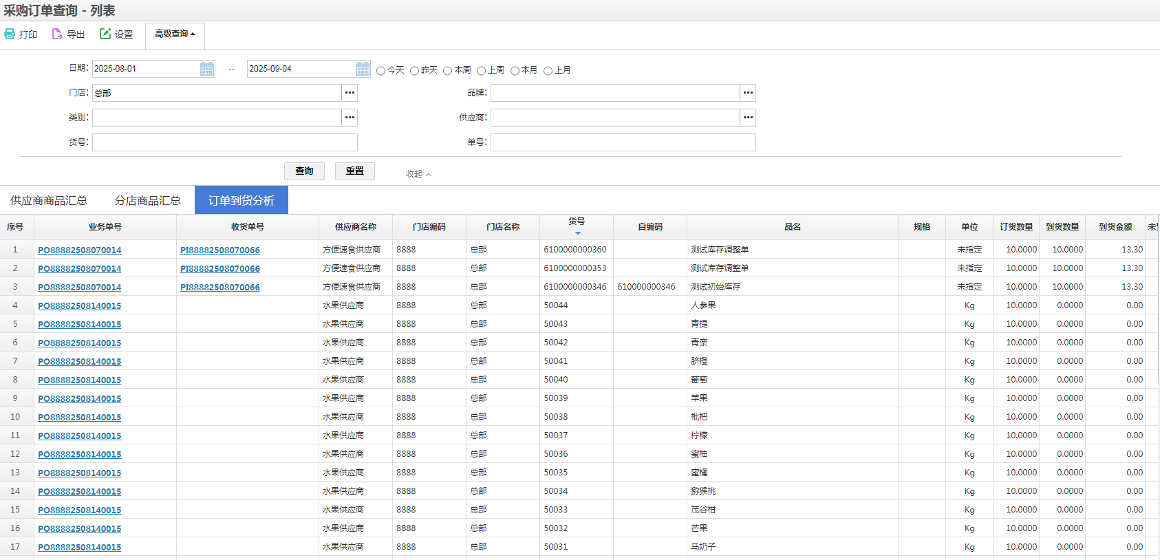 采购订单查询报表用于查看商家与供应商之间的订货、实际到货情况。