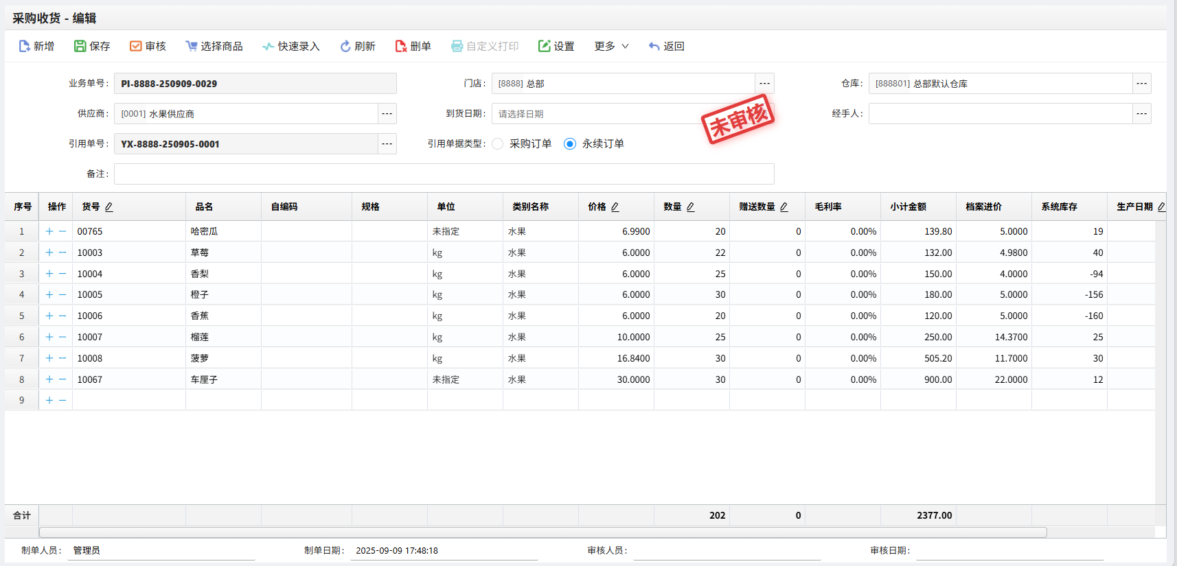 商品采购收货,选择收货的门店、仓库、供应商等信息,录入/导入收货的商品和数量,保存审核即可生效。
