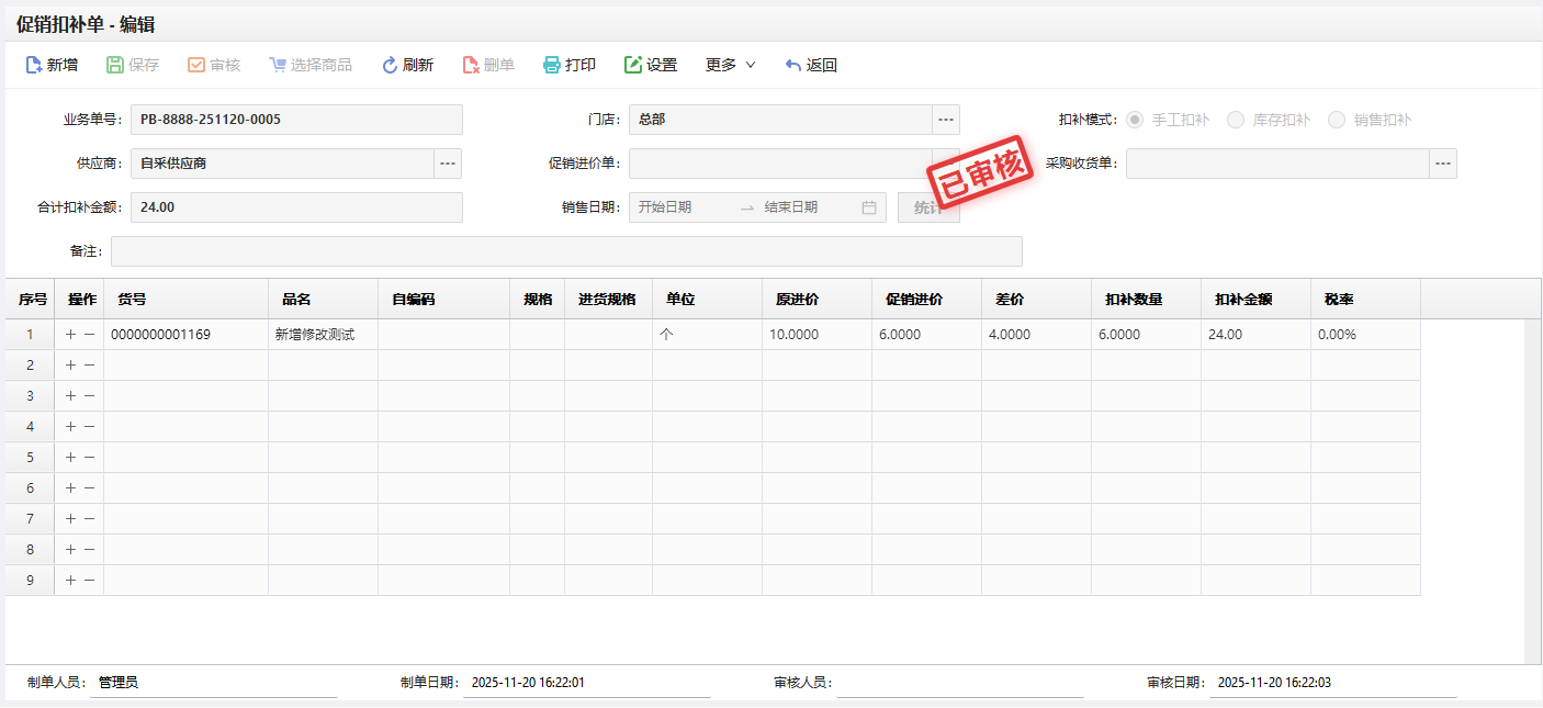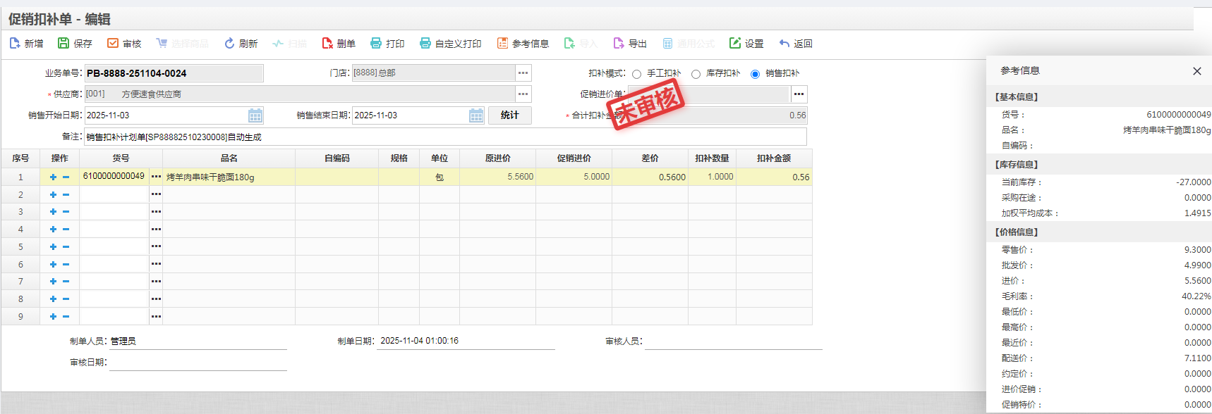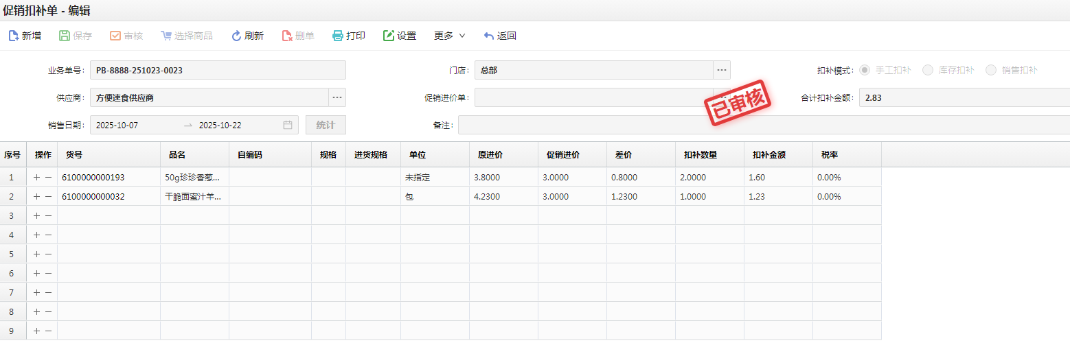 库存扣补:在做促销扣补单时,选择扣补模式为库存扣补,选择扣补供应商,必须引用促销进价单,会自动获取扣补的商品和差价,点击“统计”会自动统计商品的库存数量,保存审核即可生效。