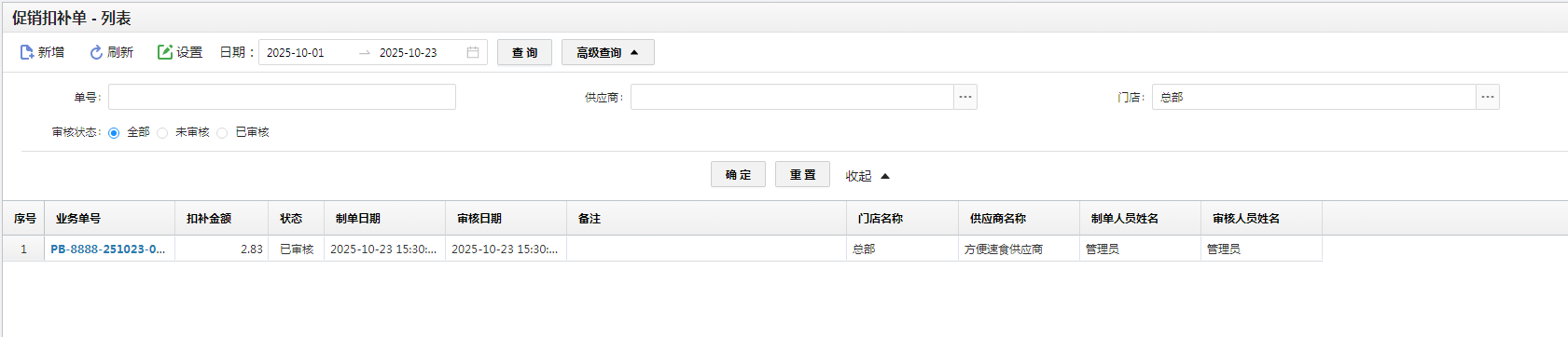 扣补单据审核之后,在供应商对账单处支持提取促销扣补单,可进行对账和结算。