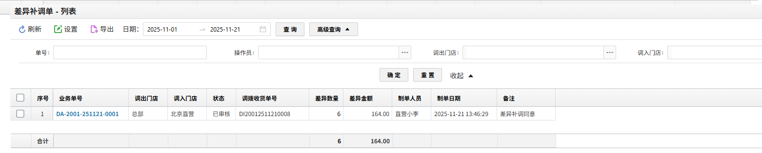 差异补调单是当调拨出库门店的调出数量低于调拨收货门店的调入数量时,自动生成的差异补调单据,需要将已收货而未调出的部分商品从调出门店重新调出。