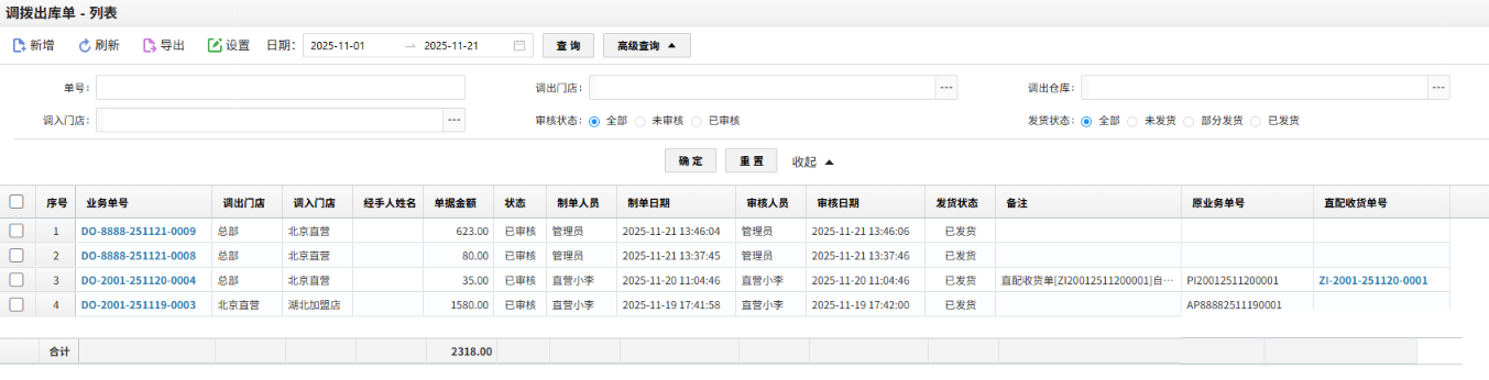 (4)单据状态为已审核,说明此调拨出库单已发货给门店;单据状态为未审核,说明此调拨出库单还未发货给门店。