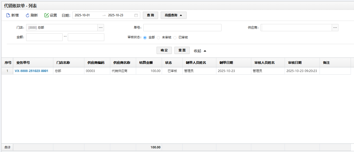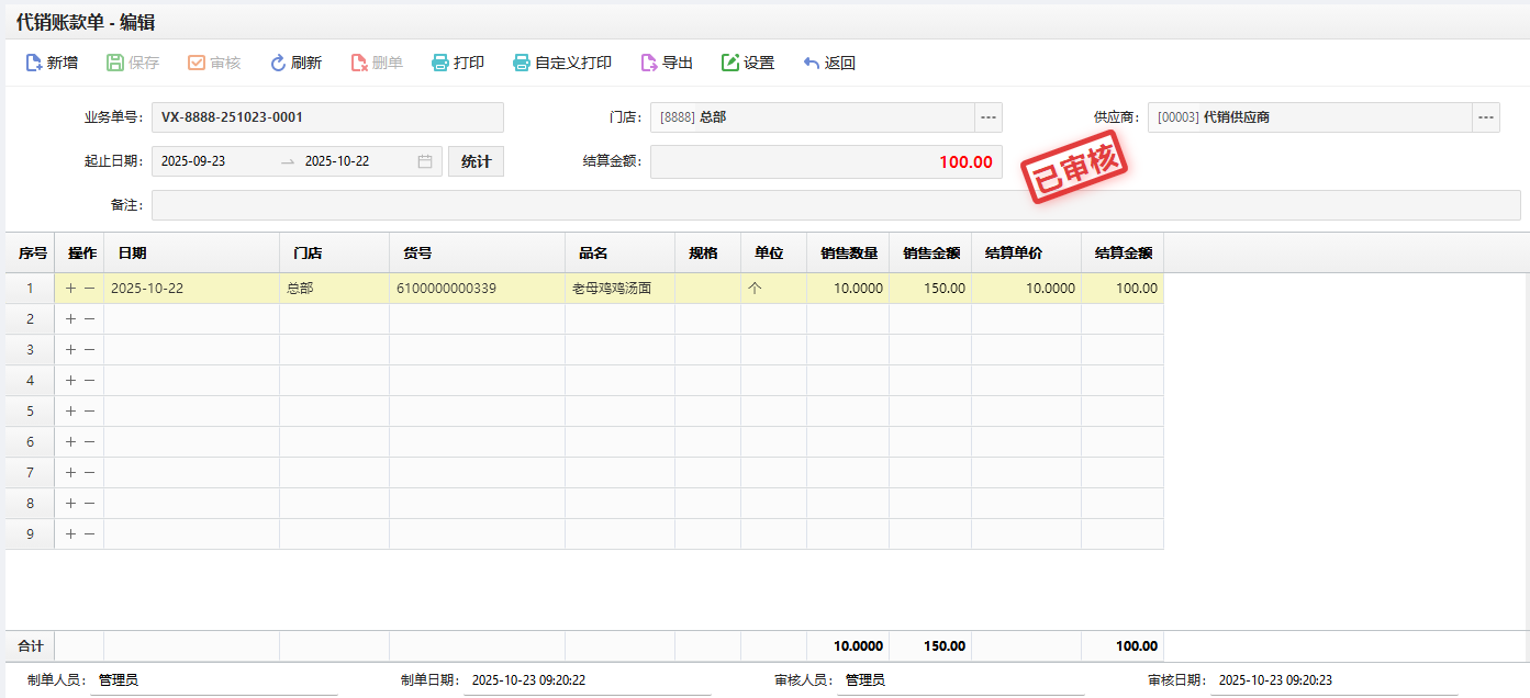 代销账款单中选择代销供应商信息,选择账款统计时间,点击统计,会自动统计代销商品销售明细以及结算单价,保存审核即可生效。