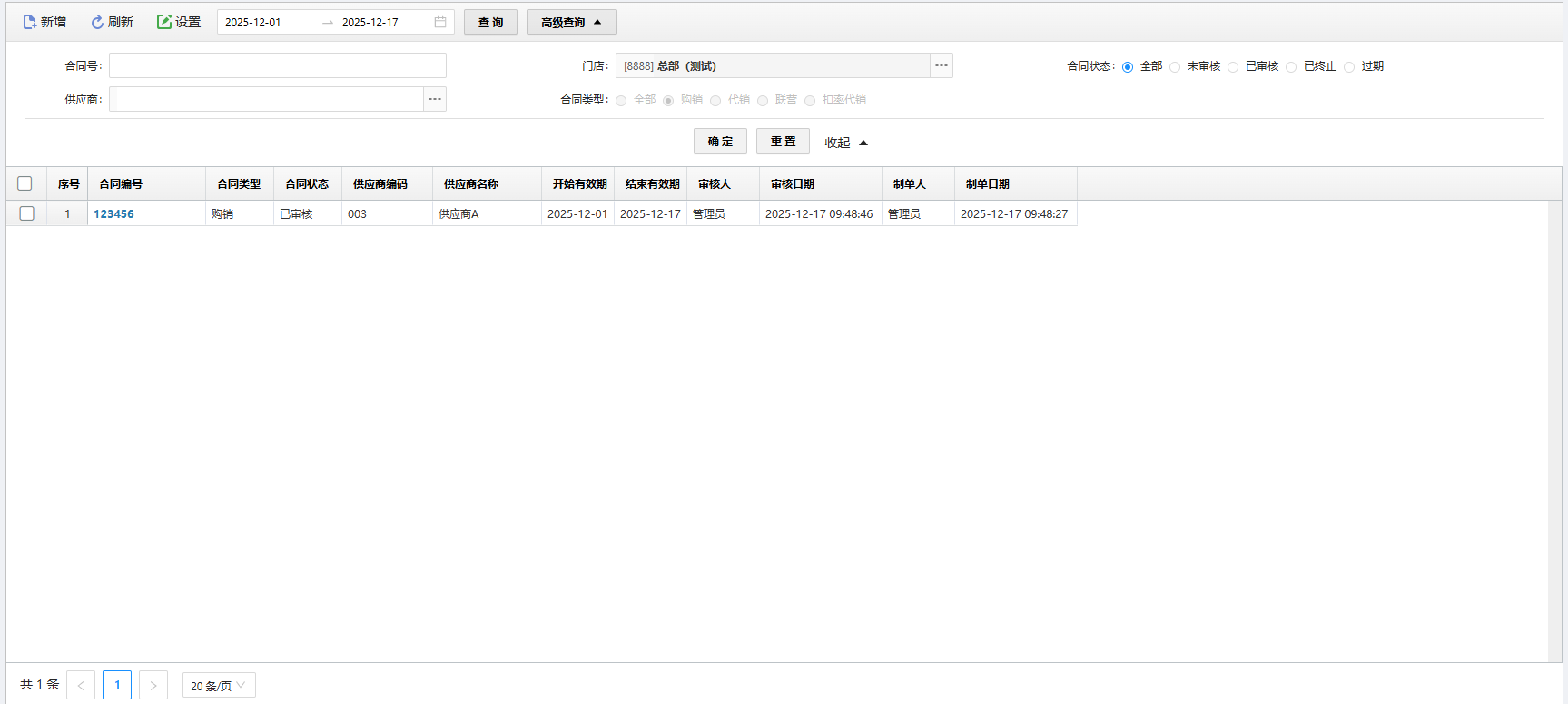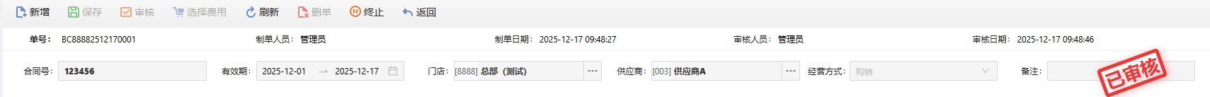 - 审核:对已保存,确认无误的购销供应商合同进行审核,审核后即可生效。