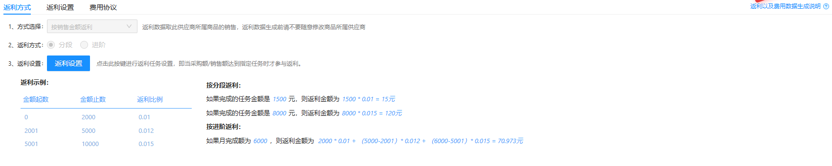 - 分段:返利金额=进货/销售总额*进货/销售总额所在金额区间端对应的返点比率