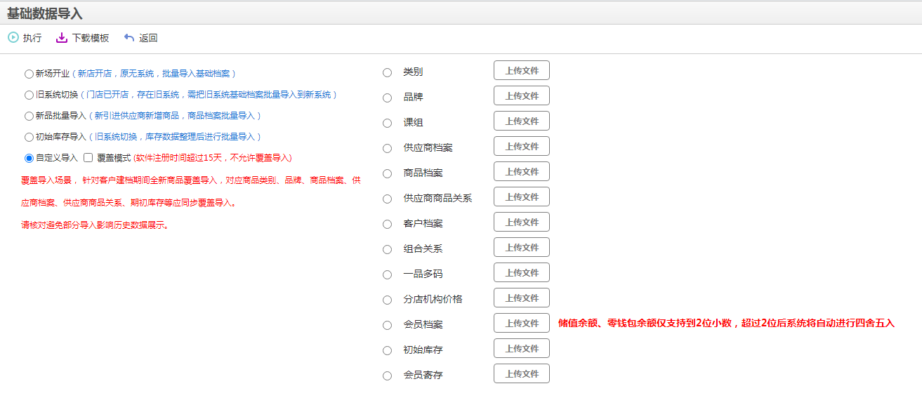 (5)自定义导入:类别、品牌、课组、供应商档案、商品档案、供应商商品关系、客户档案、组合关系、一品多码、分店机构价格、会员档案、初始库存导入、会员寄存。