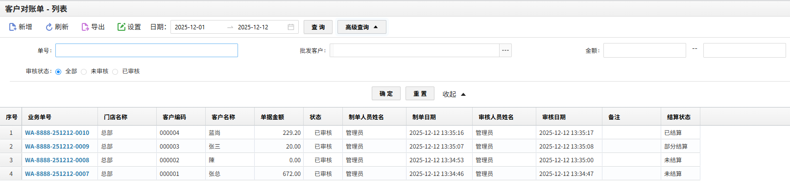 客户对账单中选择批发客户信息,选择对账统计时间,点击统计,会自动统计批发客户所有未对账的业务单据,选择账款无误的单据,保存审核即可生效。
