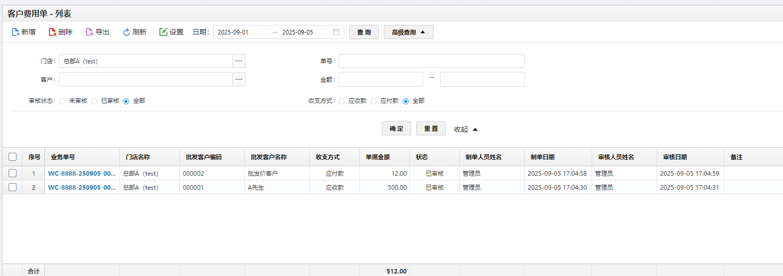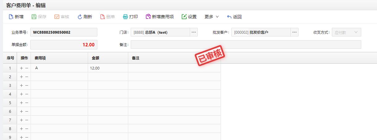 客户费用单中选择结算门店、收支方式、批发客户信息,并选择费用项录入费用金额,保存审核即可生效。