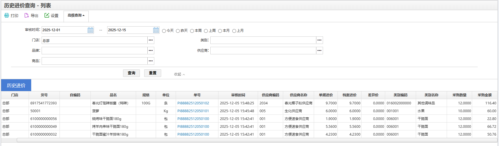 历史进价查询报表用于纪录商品每次采购的历史进价。 位置:【采配】-> 【采购查询】-> 【历史进价汇总】 提供1年内 商品采购查询价格明细特别说明:1、点击业务单号,会跳转到采购收货单详情界面。2、数据来源:已审核的 采购收货单(含:生鲜收货单) 两个单据,单据时间取 审核时间,精确到时分秒 如图所示 文档更新时间: 2025-12-15 09:12 作者:macp