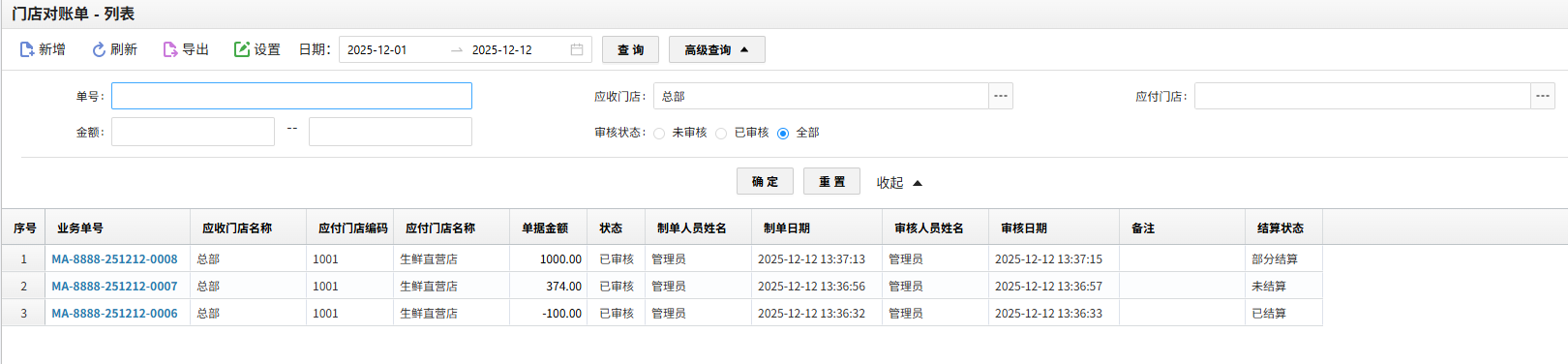 门店对账单中选择应付门店,选择对账统计时间,点击统计,会自动统计应收门店和应付门店之间所有未对账的业务单据,选择账款无误的单据,保存审核即可生效。