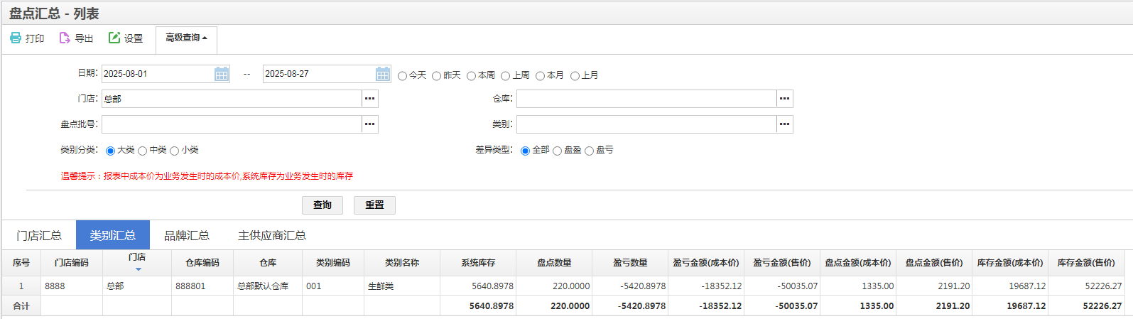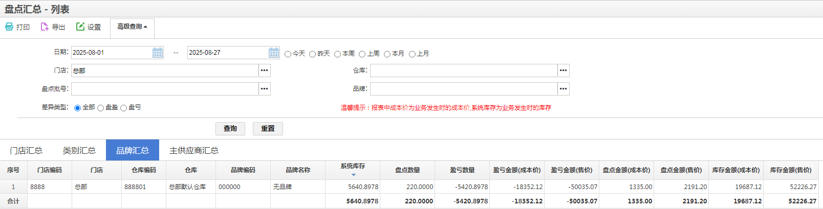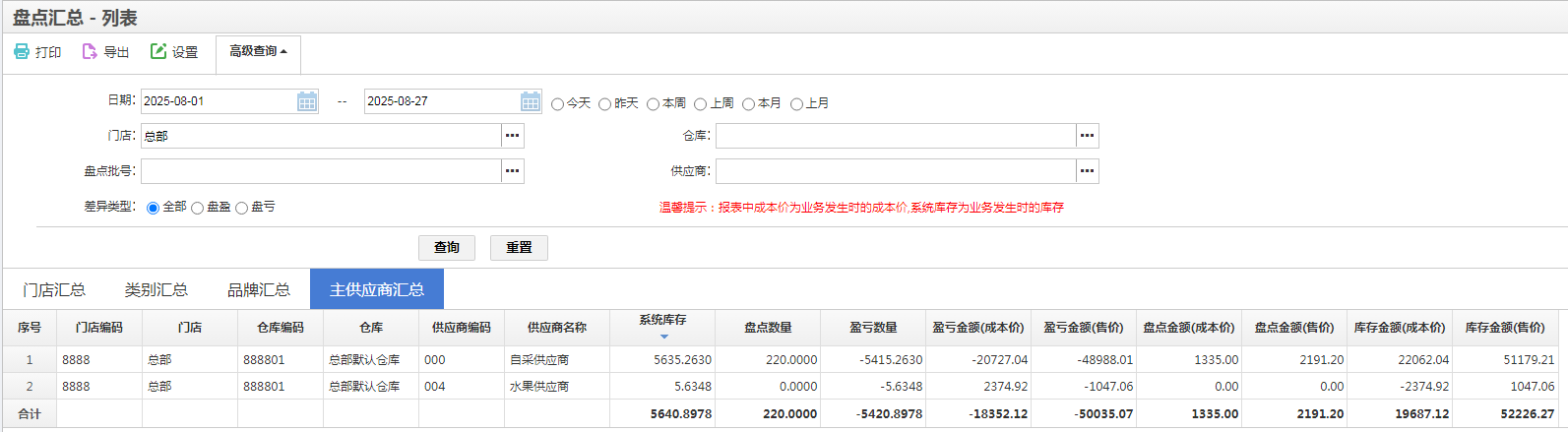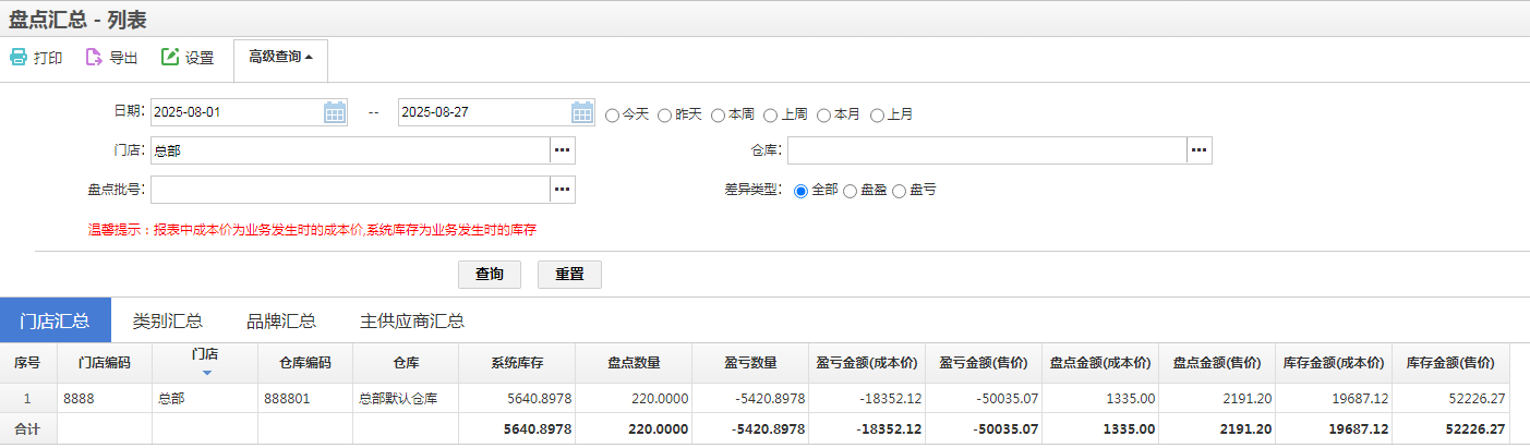 盘点汇总报表可以帮助查询盘点汇总数据。