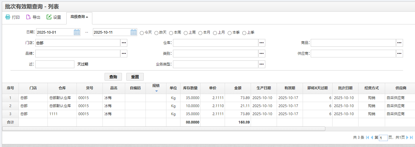 在【系统设置】中启用批次管理后,在批次有效期查询中可以查询批次商品的有效期情况。 位置:【营运】-> 【库管】-> 【批次业务】 (1)时间筛选:默认查询当前月份数据(2)总部可查询全部门店的数据,默认查询本门店,分店仅支持查询本门店数据。 如图所示 文档更新时间: 2025-10-11 09:28 作者:lixq