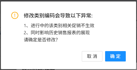 - 修改:修改类别编码后,进行中的该类别相关促销不生效,同时影响历史销售报表的展现。修改保存时系统会有相关提示,如图三