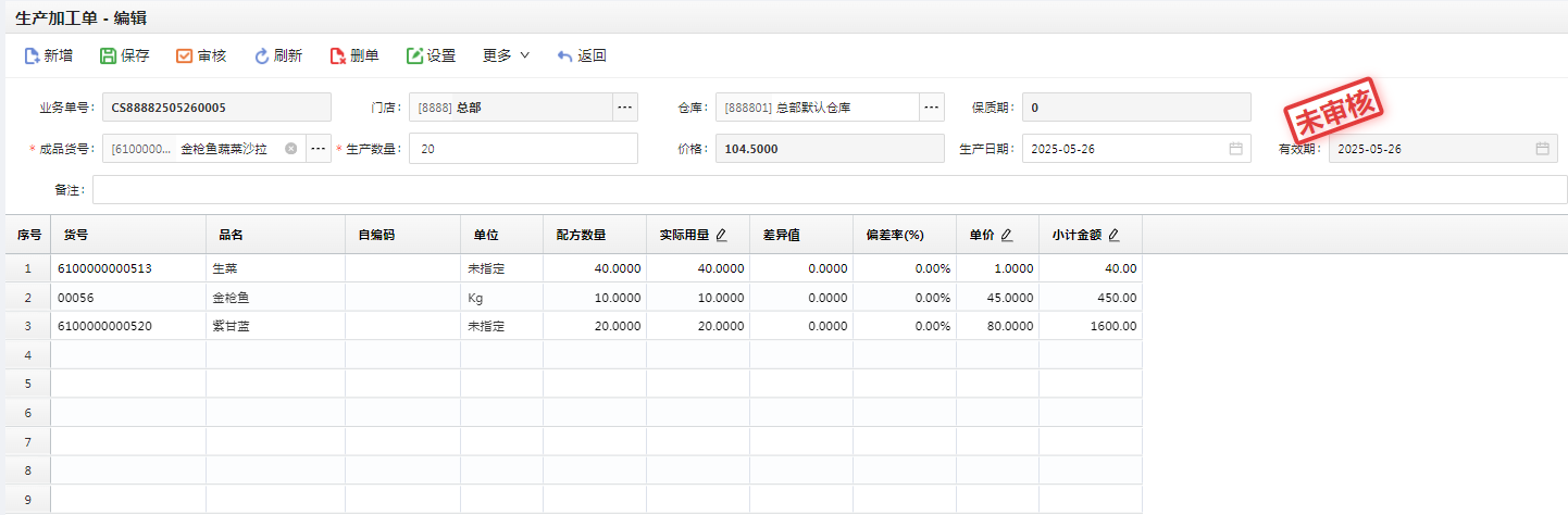 生产加工单是获取BOM配方中的生鲜制单组合商品,进行成分商品组合加工业务。