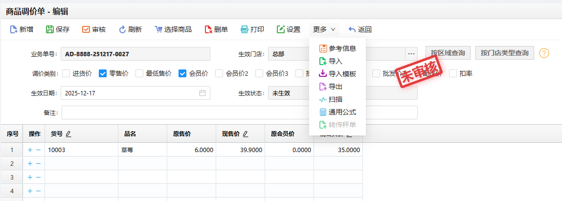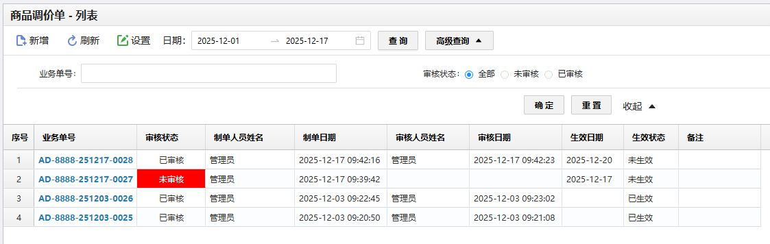 2、调价单生效状态:未生效(即已审核但是未到生效时间、或未审核的单据状态为待生效)、已生效(已到生效时间,且单据已审核)