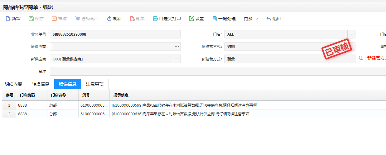 3. 待转商品如存在门店约定供应商,则不能转为联营|自产经营方式供应商;
