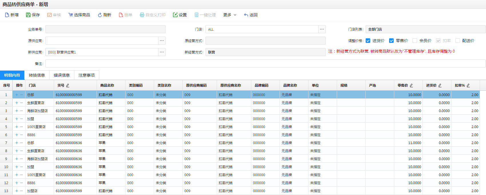 5. 商品转为联营供应方式时,被转商品默认改为”不管理库存”,且库存默认改为0;