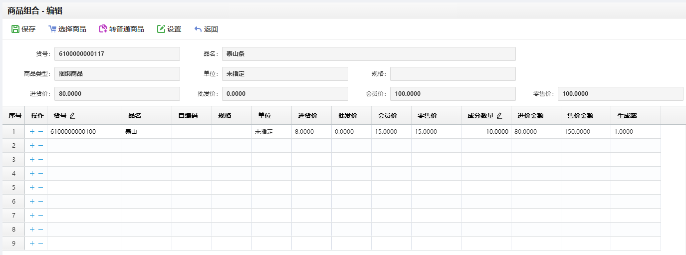 页面下部分:需要选择对应的组合商品,编辑当前主商品的成分商品,商品类型为“普通商品”。