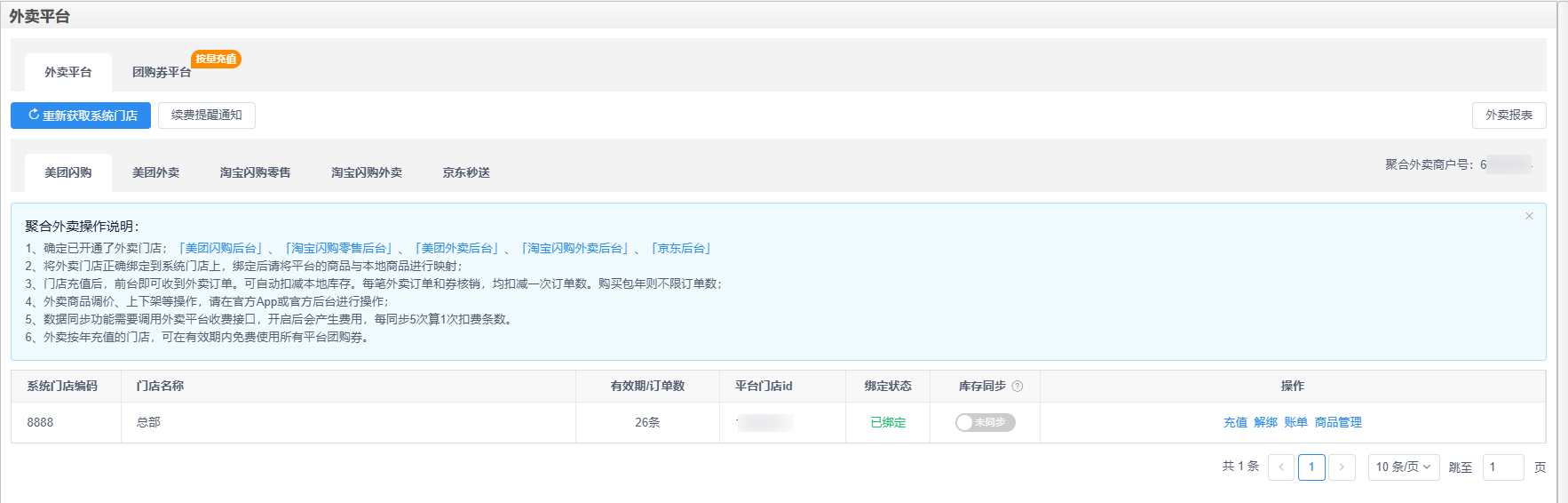 位置:【平台】-> 【外卖平台】-> 【外卖平台】 对接外卖平台:「美团闪购」、「淘宝闪购零售」、「美团外卖」、「淘宝闪购外卖」、「京东秒送」 如图所示 外卖平台使用手册 文档更新时间: 2026-02-12 02:04 作者:admin