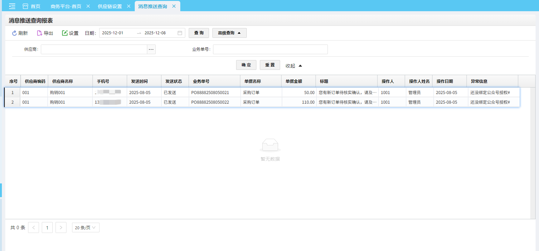 位置:【平台】->【商务平台】->【自助服务】概述:供应链系统通过微信平台给绑定了公众号的供应商实时推送订货单、账款等消息通知,供应商可以通过微信实时确认处理,此处可以查询到相关消息的推送状态。 如图所示 文档更新时间: 2025-12-08 05:38 作者:admin