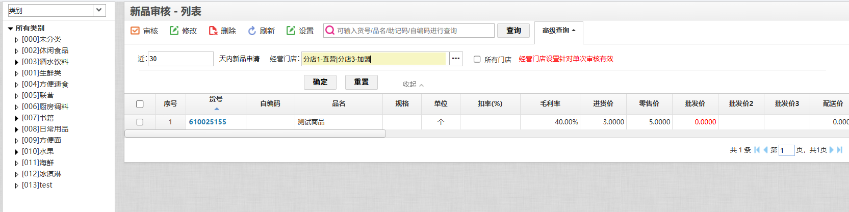 列表默认显示 近30天 未审核 的商品信息,可通过高级查询可调整申请天数以及经营门店。选择列表中的新品点击审核,已审核的新品则会同步到商品档案中。