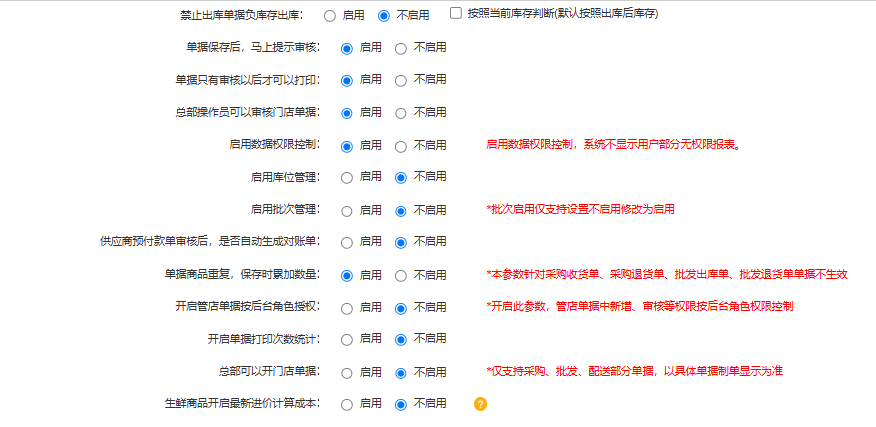 禁止出库单据负库存出库: 启用 不启用 按照当前库存判断(默认按照出库后库存)