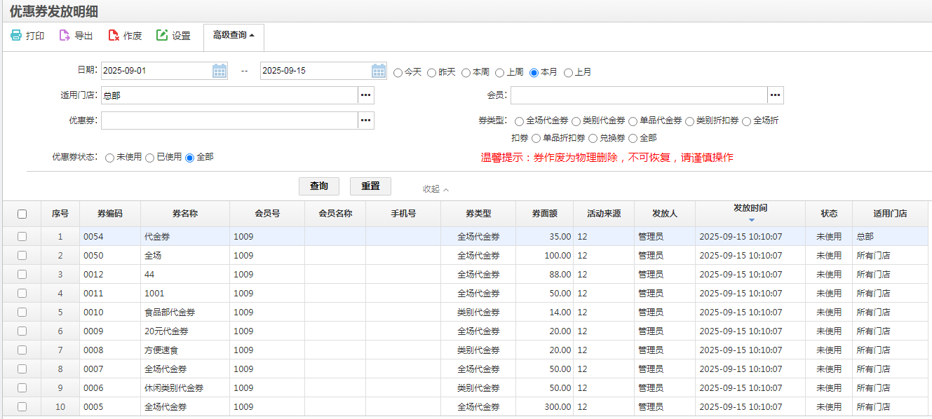 位置:【营运】->【促销】->【营销查询】 在优惠券发放明细中,默认可查看本月的优惠券发放明细,点击高级可以选择优惠券状态来进行查询默认查询全部,可对查询的结果进行打印、导出,可勾选对应序号的优惠券进行作废。 如图所示 文档更新时间: 2025-09-15 05:34 作者:admin